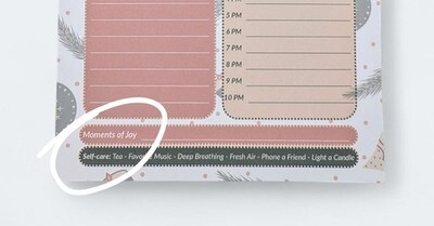 Pine branches and ornaments Holiday 2025 Christmas-themed daily planner. A full page notepad with moments of joy, self care, and hydration sections, lined with chipboard. The perfect organization tool for busy workdays and reminders to take care of yourself - because you matter.