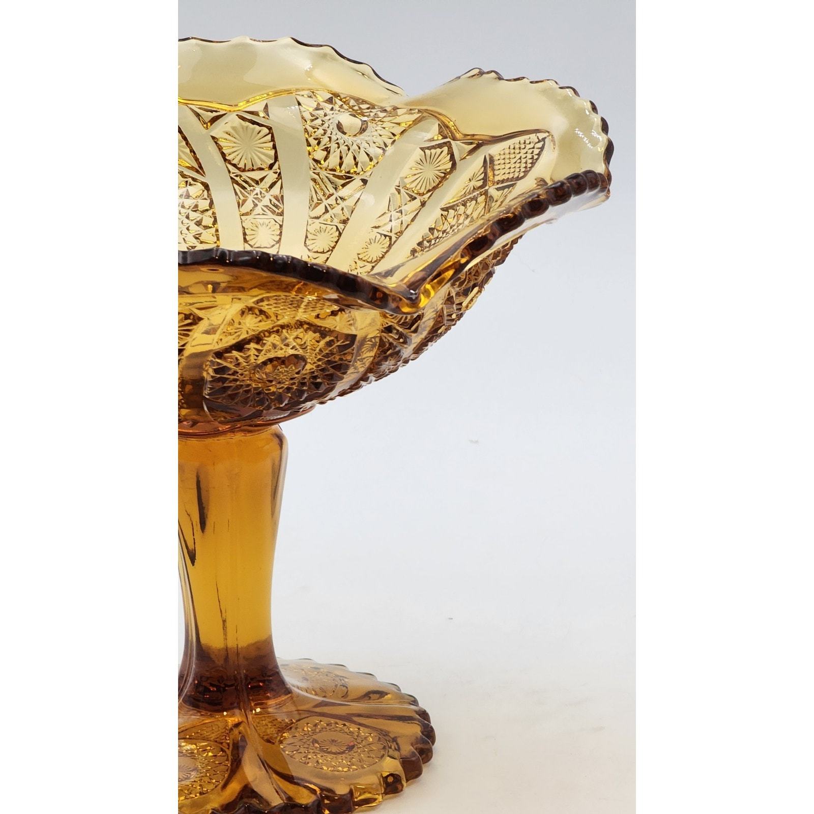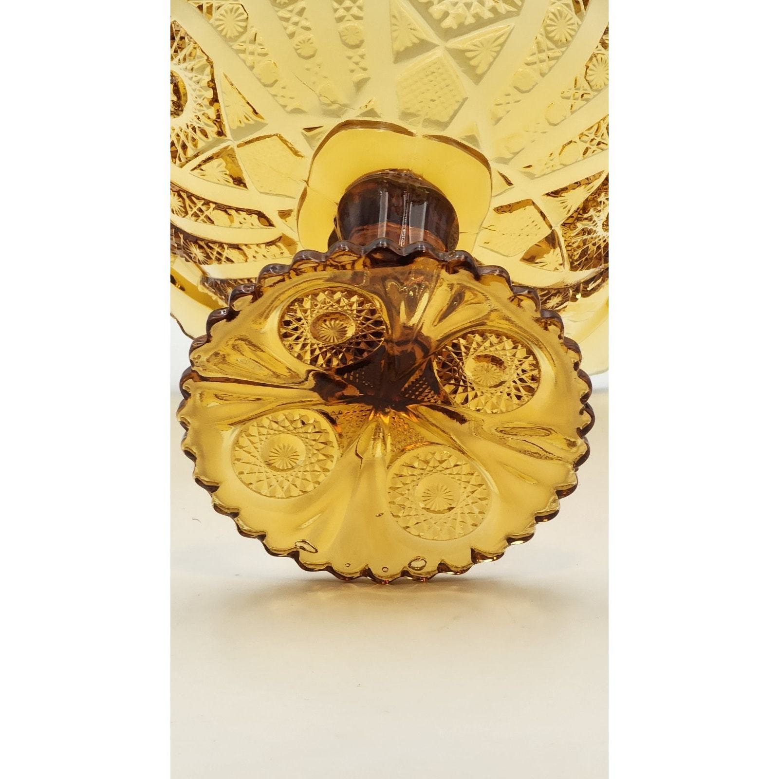 The product is a vintage 7" tall compote made by Imperial Glass in Ohio. It features a daisy and button pattern in amber colored glass, adding a touch of elegance to any table setting. The tall compote is perfect for serving fruits, candies, or other snacks in style. Made of high-quality glass, it is a beautiful and durable piece of decorative glass that would make a great addition to any collection.
