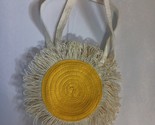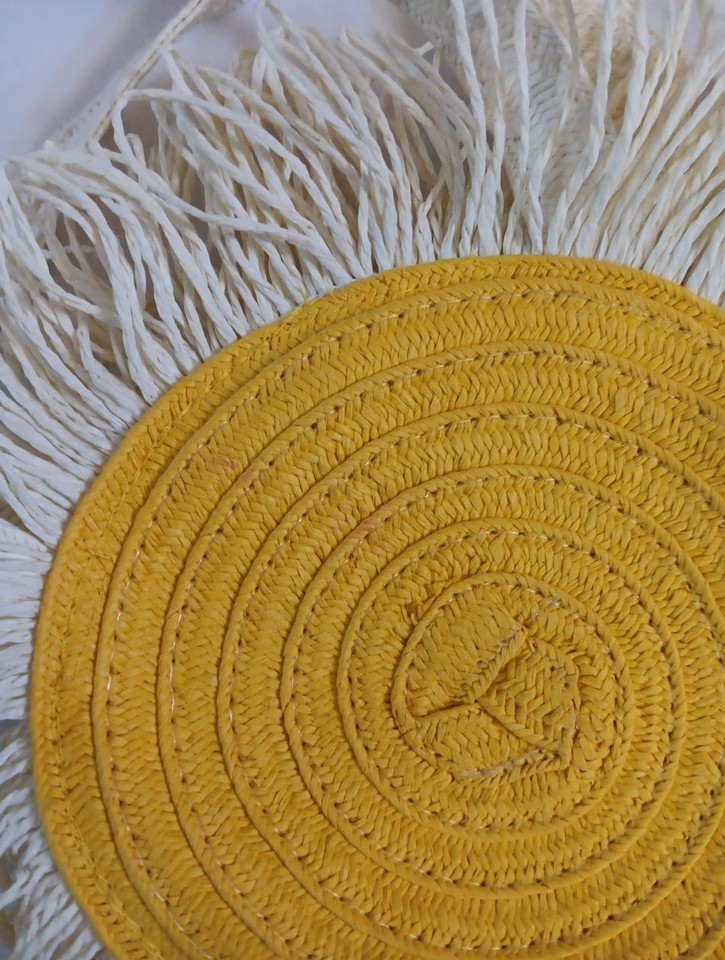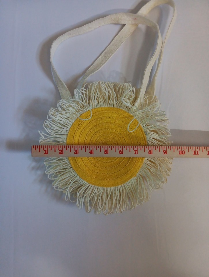 The Girls/Women's ROCKAHULA Yellow Daisy Handbag is a small, round-shaped novelty bag with a fun snap closure. The exterior and lining are made from a cotton blend material, featuring a vibrant yellow color with a daisy shape. The bag has a unique boho style, perfect for adding a touch of personality to any outfit. With a white cotton blend handle/strap and a size of 9 inches in width, height, and 8 inches in depth, this handbag is ideal for girls or women looking to make a statement with their accessory. Normal wear. See Pictures.