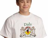 Product description: Daly Irish Coat of Arms Tee Shirt in White. Every Irish family has a story to tell, probably hundreds of stories. Your Irish coat of arms is a visual record of your family's oldest, most significant stories. Here, they're told in bright, permanent artwork on these fine-quality, 100% cotton Gildan tee shirts. Over 25 years of heraldry research and over 1000 available Irish family coat of arms.