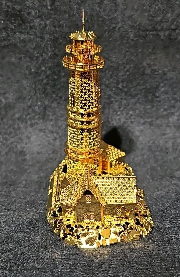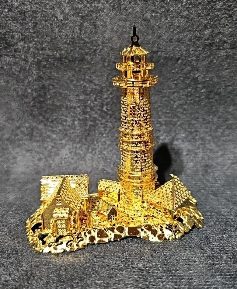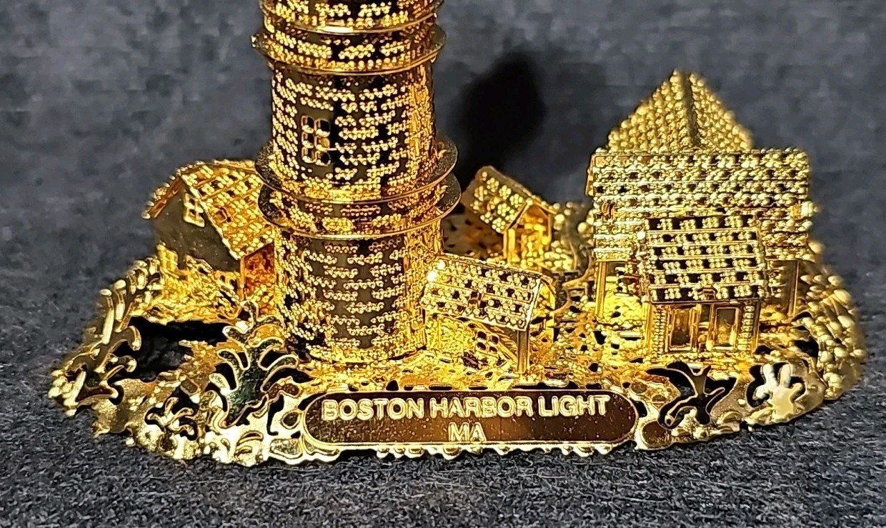 Crafted in high detail and electroplated in 23kt gold, it represents the Boston Harbor Lighthouse, one of the most historic and recognizable beacons on the East Coast.
