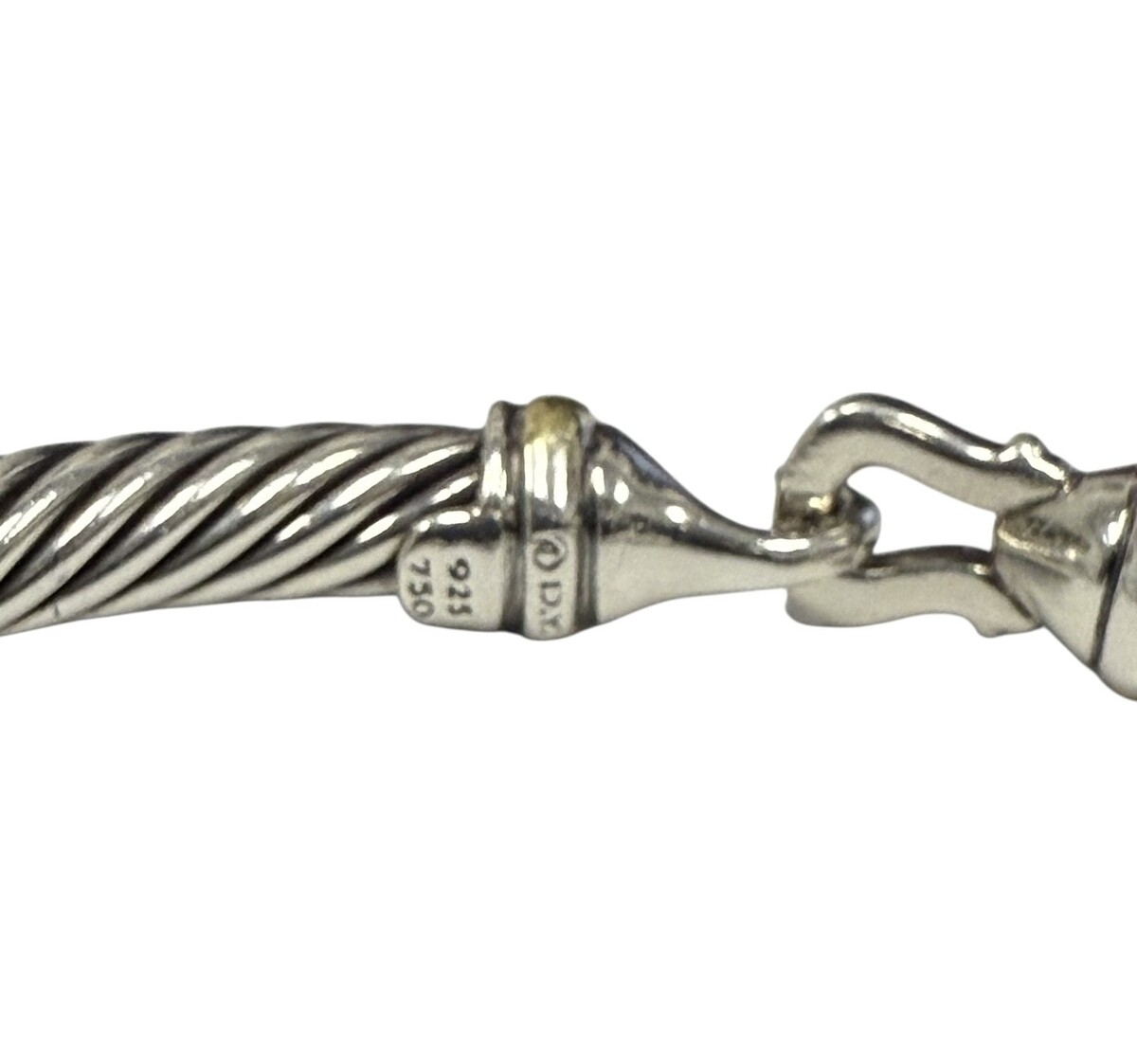 Type: BangleWeight: 19.6Karat: .925Metal: Silver and GoldGender: Women'sStyle: FancyBrand: David YurmanSize / Length: 6.5"Owner applied: DY 925 750Condition:Used