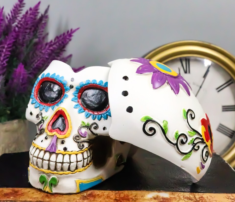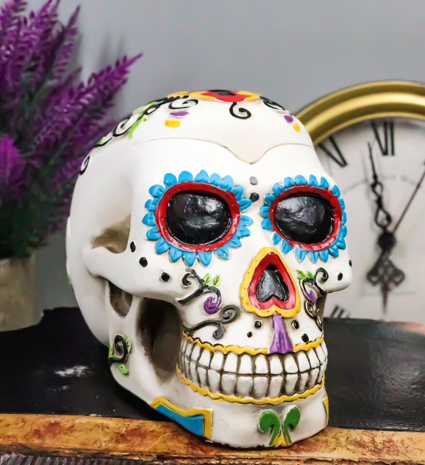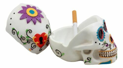 ? This sugar skull ashtray has a cool feature that has a lid cap to prevent the cigarette ash from blowing all over your furniture when you are not using the ashtray. You can also use this skull as a jewelry box, key holder or what have you. Celebrate the day of the dead spirit with this Sugar Rose Skull ashtray.