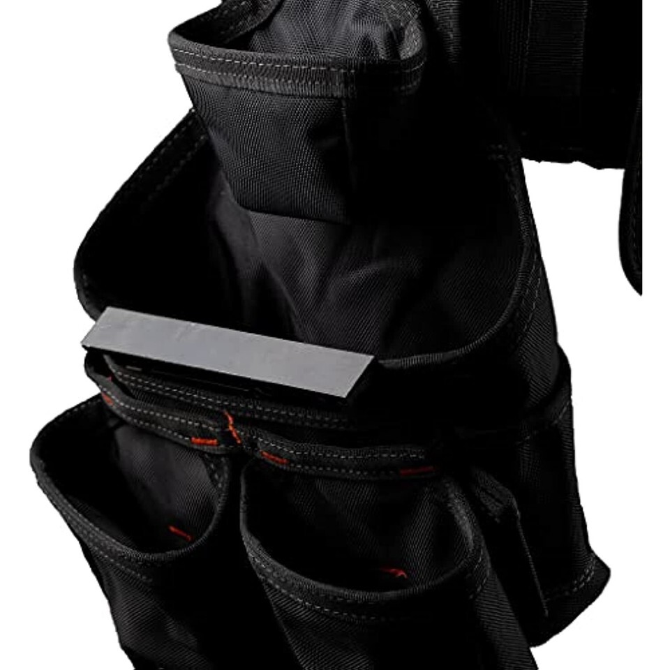 17 inside pockets and 7 outside pockets with a drill holder, steel-loop hammer holder, tape-measure holder and more