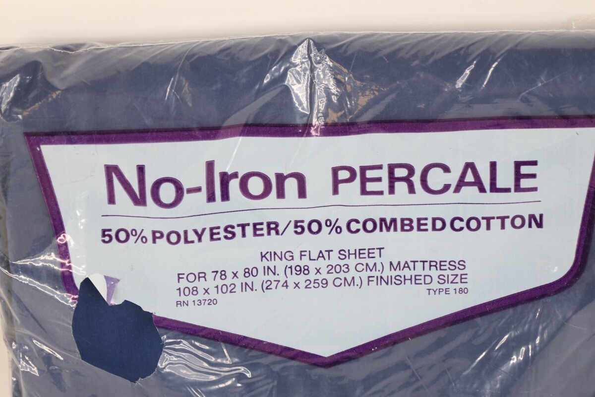 - Deadstock Vintage 80s 90s No Iron Percale King Flat Sheet Navy Blue 108x102"