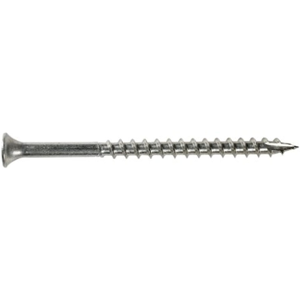 Highlights Size : #8 x 2-1/2". 305 stainless steel for superior corrosion resistance. S-17 point for improved driveability. 0.344" diameter, #2 square drive bugle head. Coarse threads approximately 2/3 up shank draw the decking tightly to the substrate. Packed in reusable heavy duty plastic buckets.
