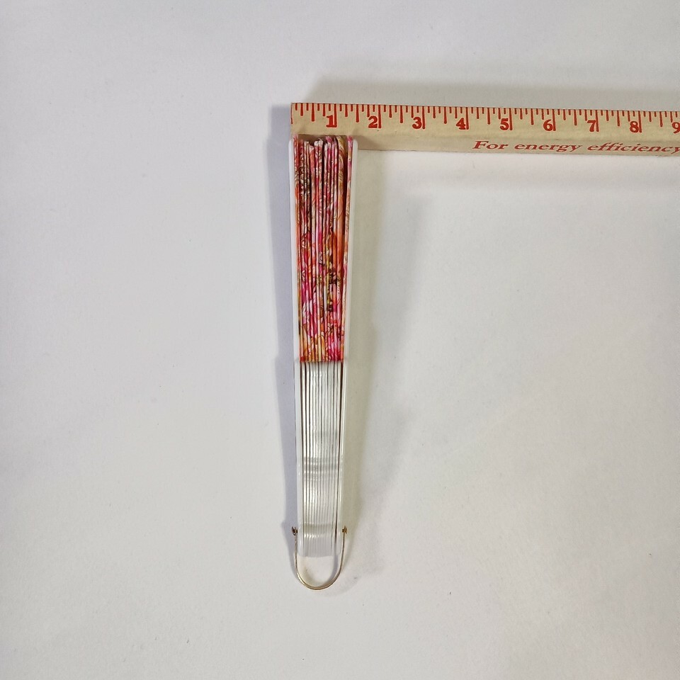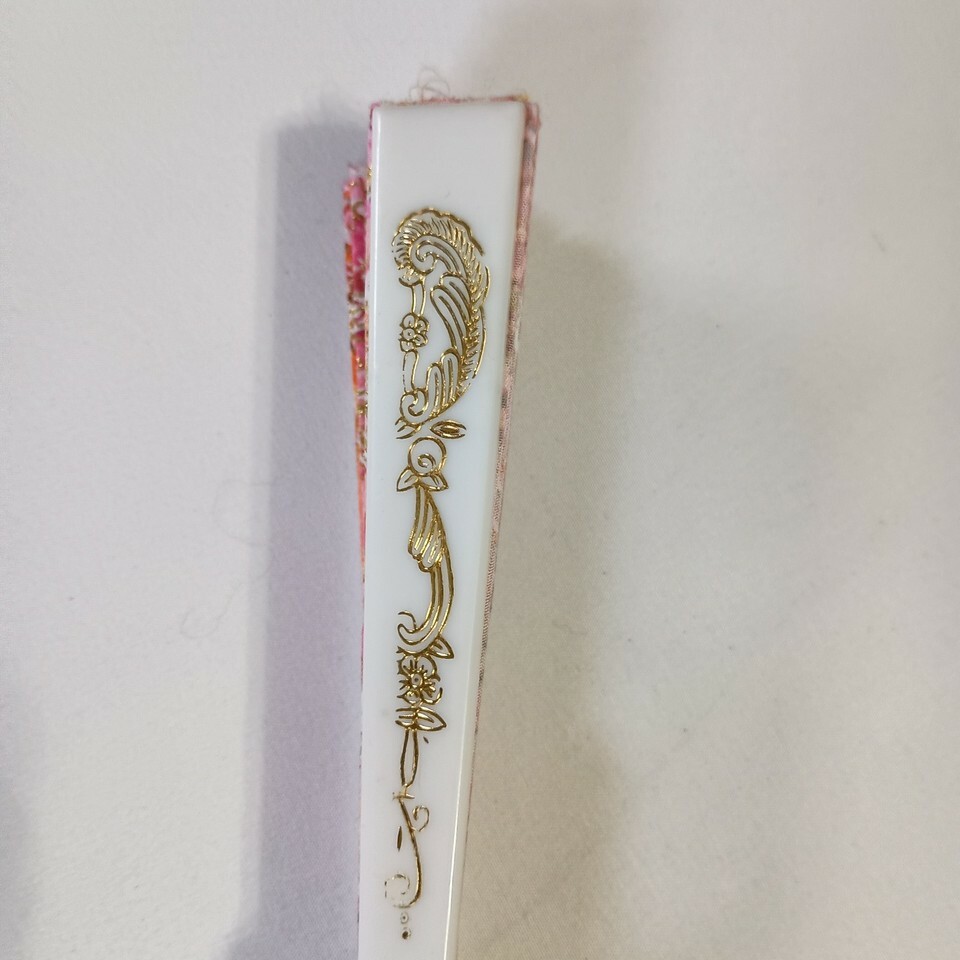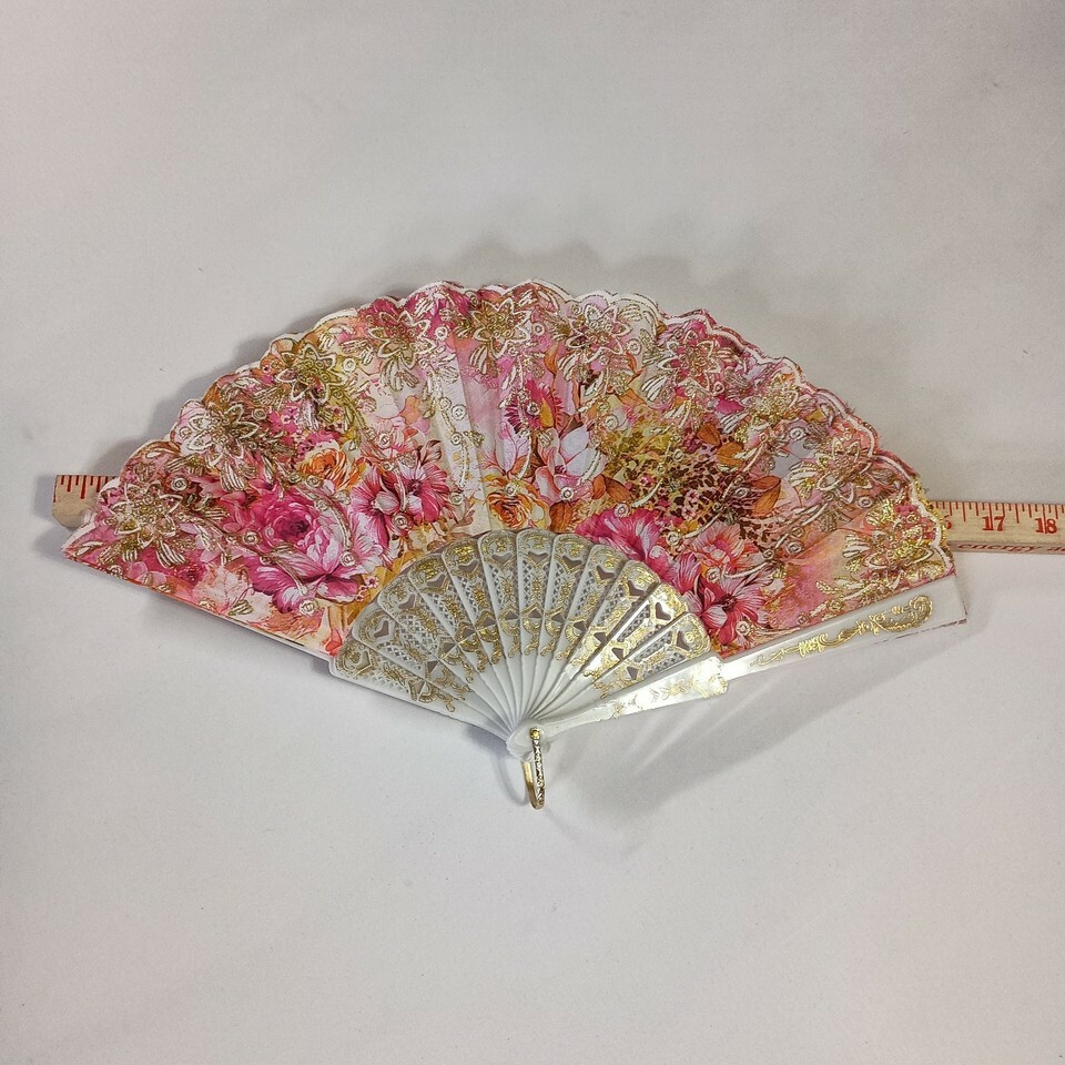 This decorative folding fan features a floral pattern in pink with gold glitter accents, adding a touch of elegance to any outfit. Made from fabric, the fan exudes an arts and crafts look, perfect for special occasions or adding a vintage touch to your attire. Its pink and gold color scheme adds a feminine and luxurious feel, making it a stylish accessory for any fashion-forward individual. Normal wear. Sizes are approximate.