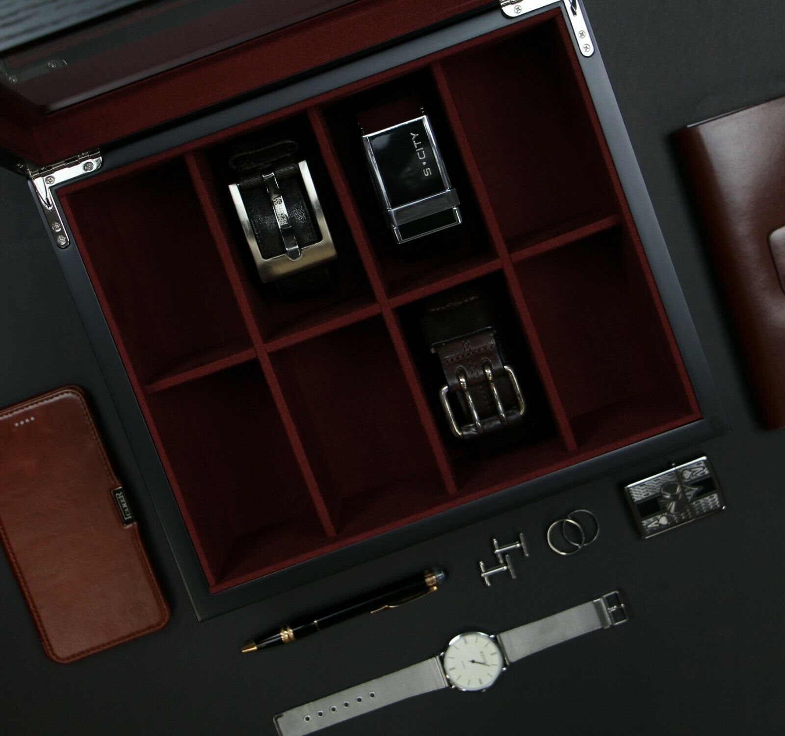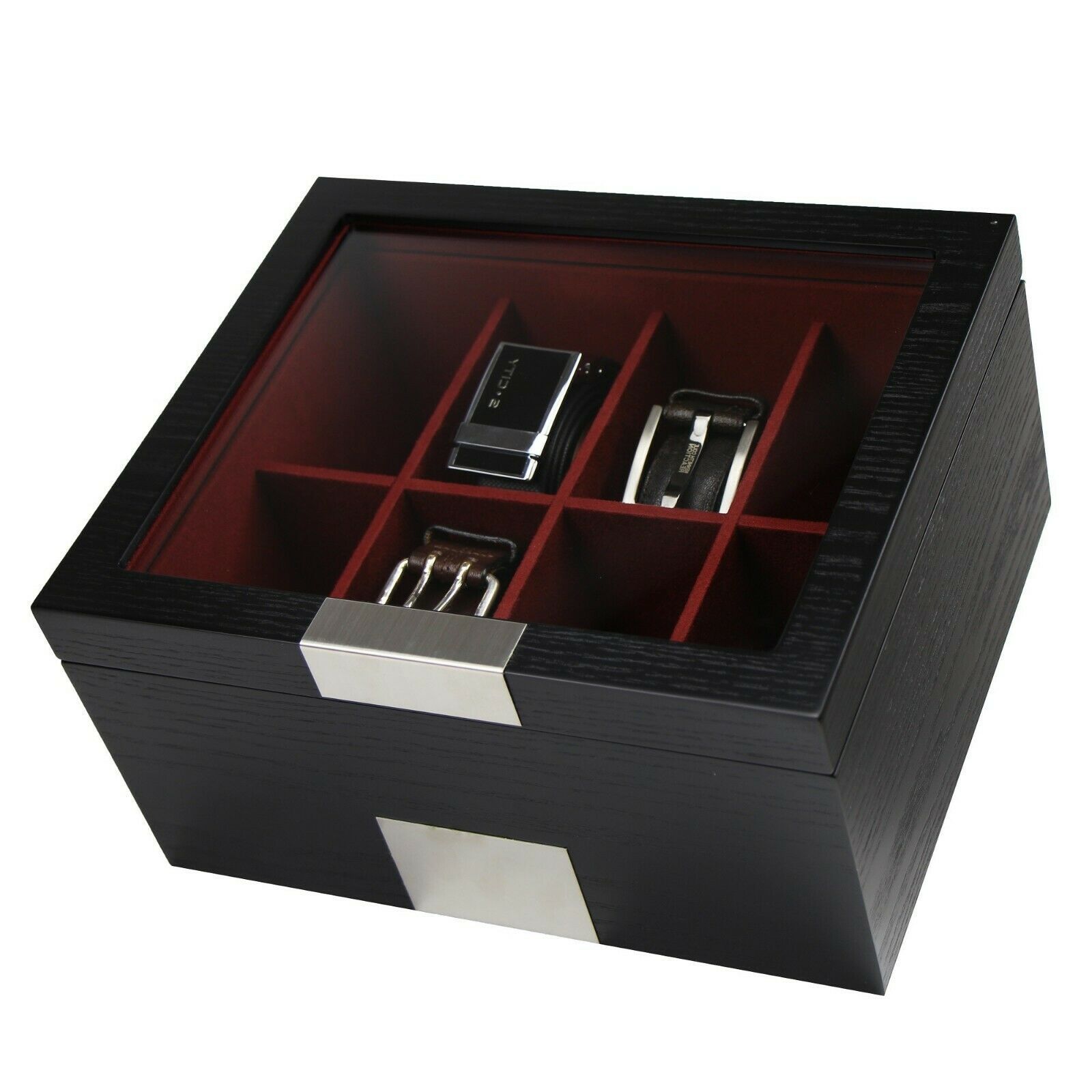 Love Life: The DecorLove Life Jewelry and Watch Box and sunglasses organizer stores it all. Its compact design features storage space for 4 watches, 3 sunglasses, cufflinks and rings. Red suede interior and soft padded divider protects your valuable watches, sunglasses, cufflinks, rings, earnings and other jewelry from scratches and scuffs.