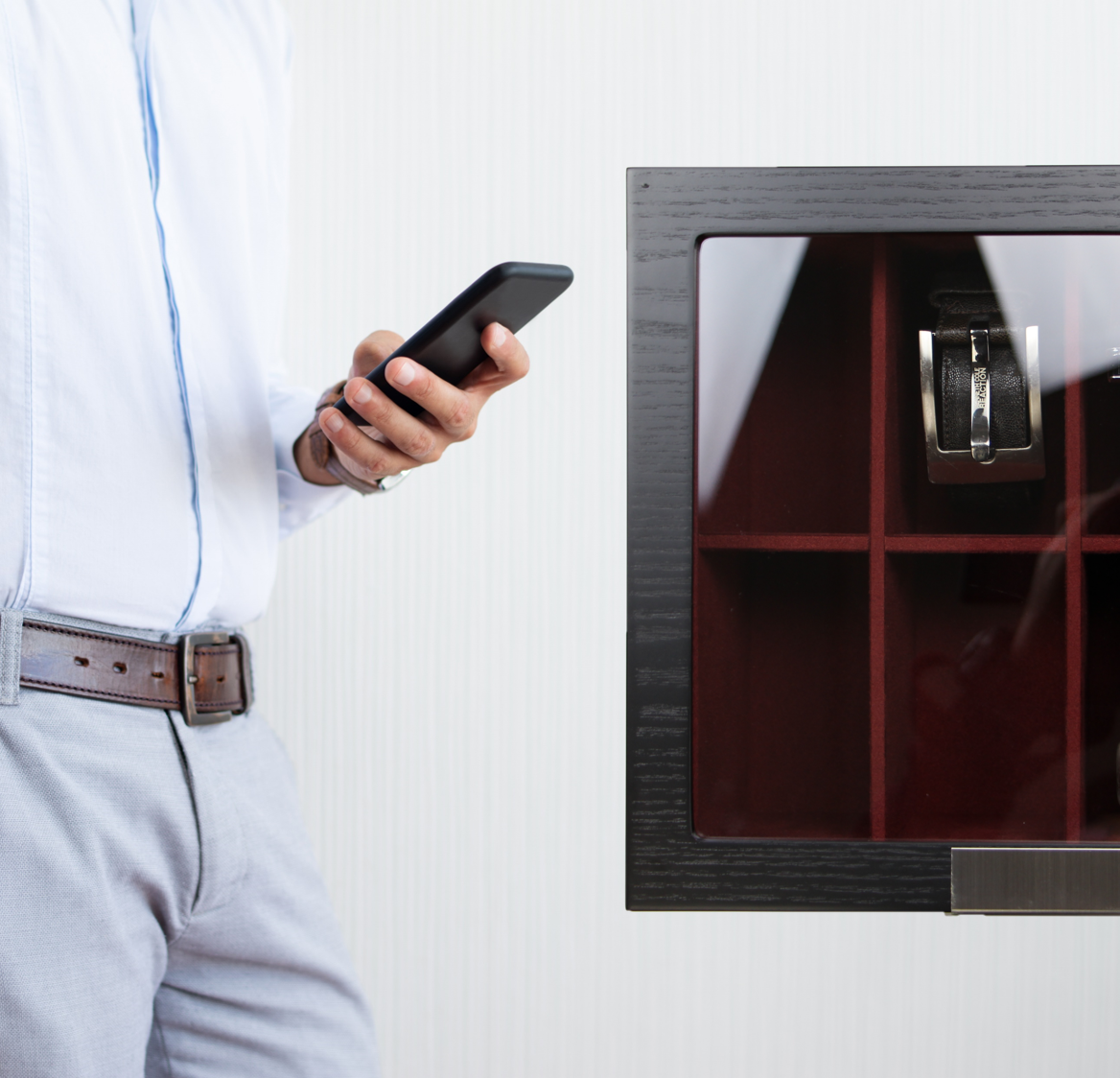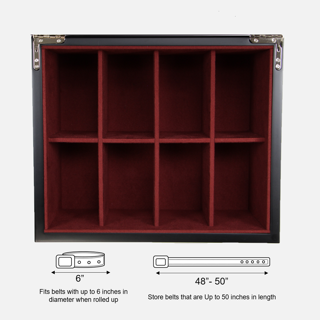 DecorExecutive Belt Man Belt Box and STorage Organizer with storage space for 8 watches with pull-out drawer to store pens, bracelets and much more, Quality built to last with its stitch less corners, sturdy walls and smooth suede interior, Enhance the appearance of any dresser with its sleek piano finished grey and black checkered pattern, Durable high clearance glass top elegantly displays watch collection for the presentation it deserves and High quality chrome hinges with lock and tasseled keys. Measures 11 by 7.5 by 7.5 Inches