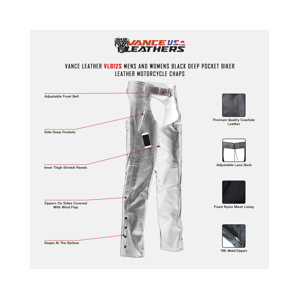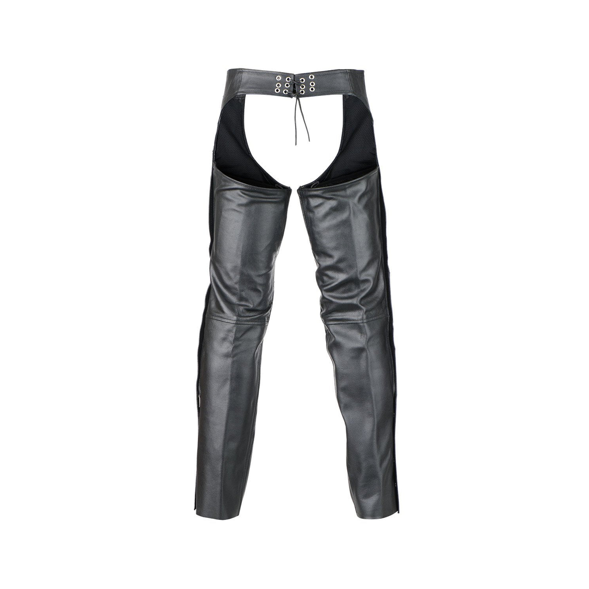 Pants Style Leather Motorcycle Chaps are a customer favorite. And it s no wonder. These chaps, which boast a mesh are very well made out of premium, heavy-duty cowhide leather. These black pants style chaps also boast an adjustable waist and can fit leg lengths between 42 and 44 inches and inseams between 32 and 34 inches. To tailor these jeans to your particular leg length, you simply need to cut them to size no hemming is necessary. Heavy and durable, these are the type of chaps you want to protect your legs if you ever have the misfortune of laying your bike down. Even better, offers these chaps at a very affordable price.