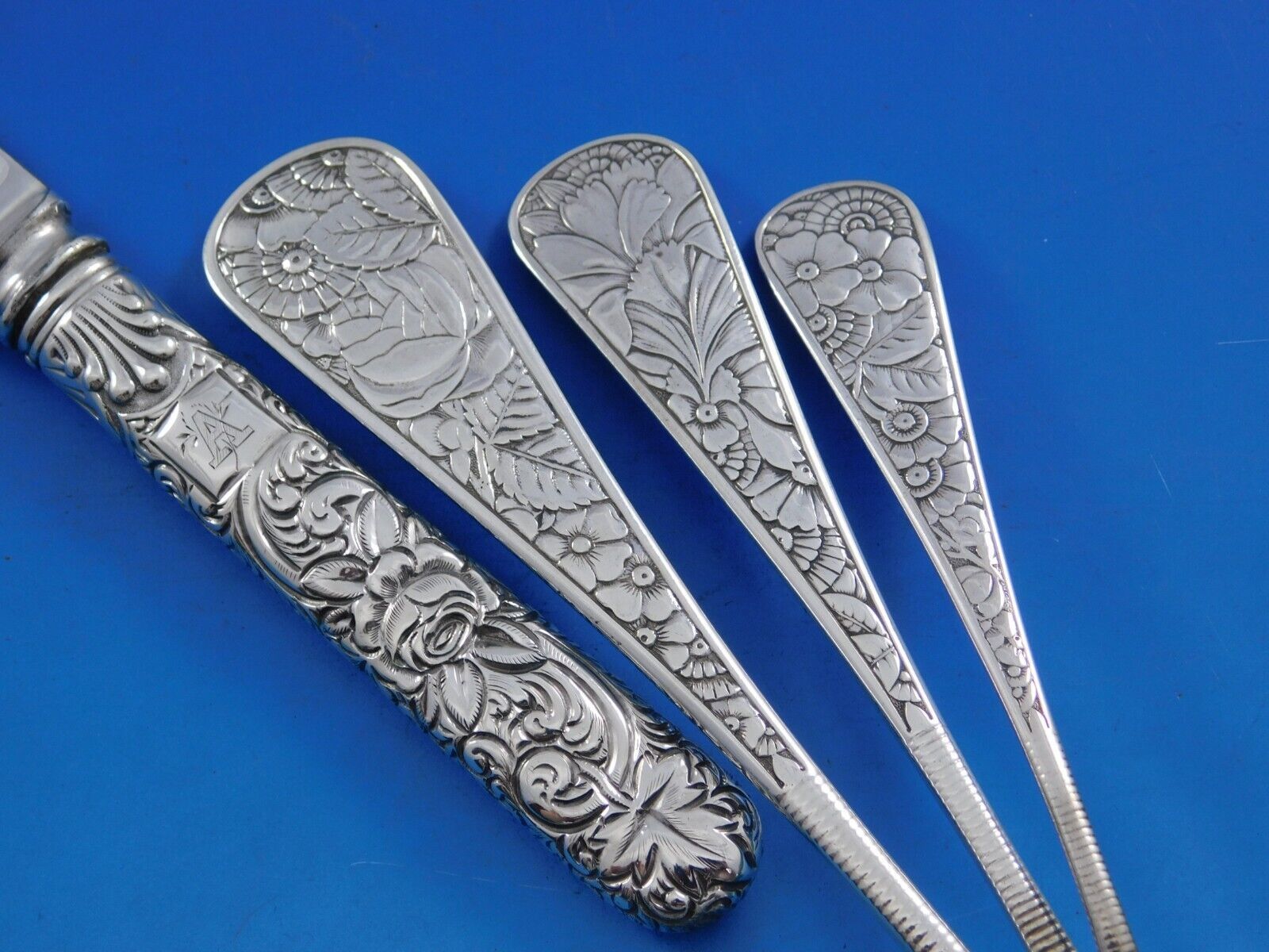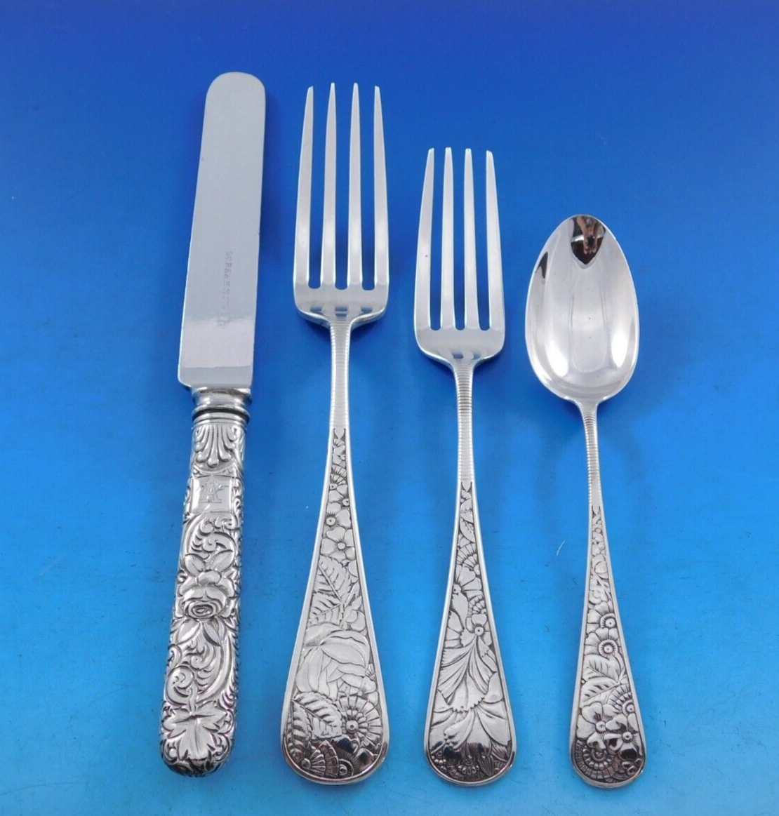 Scarce sterling silver flatware set in the multi-motif floral Delhi by Gorham pattern, circa 1880's - 17 pieces. This set includes: