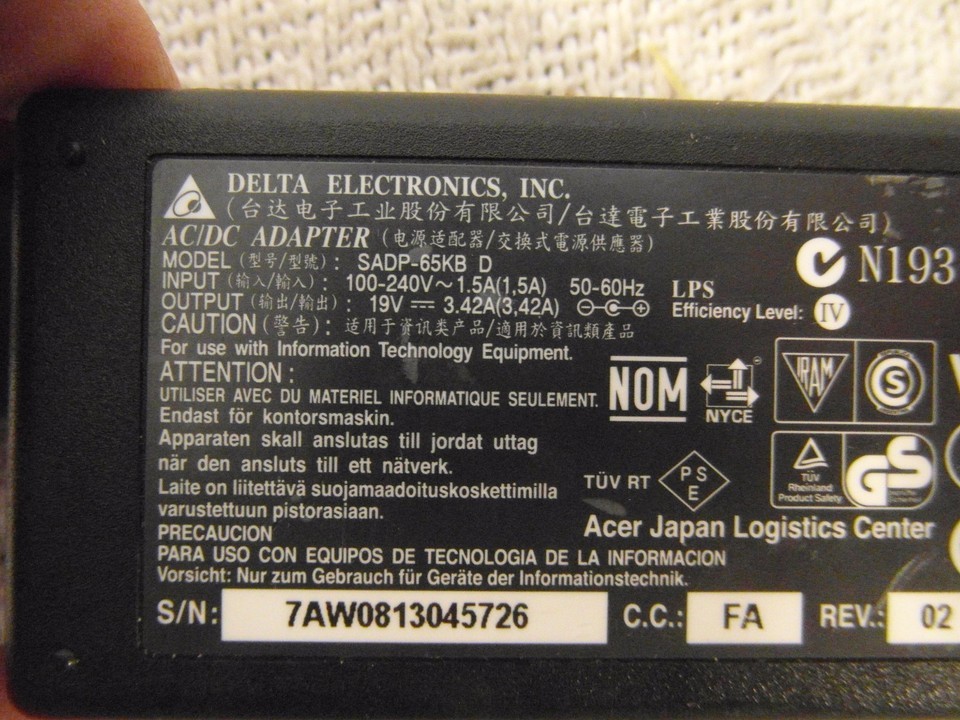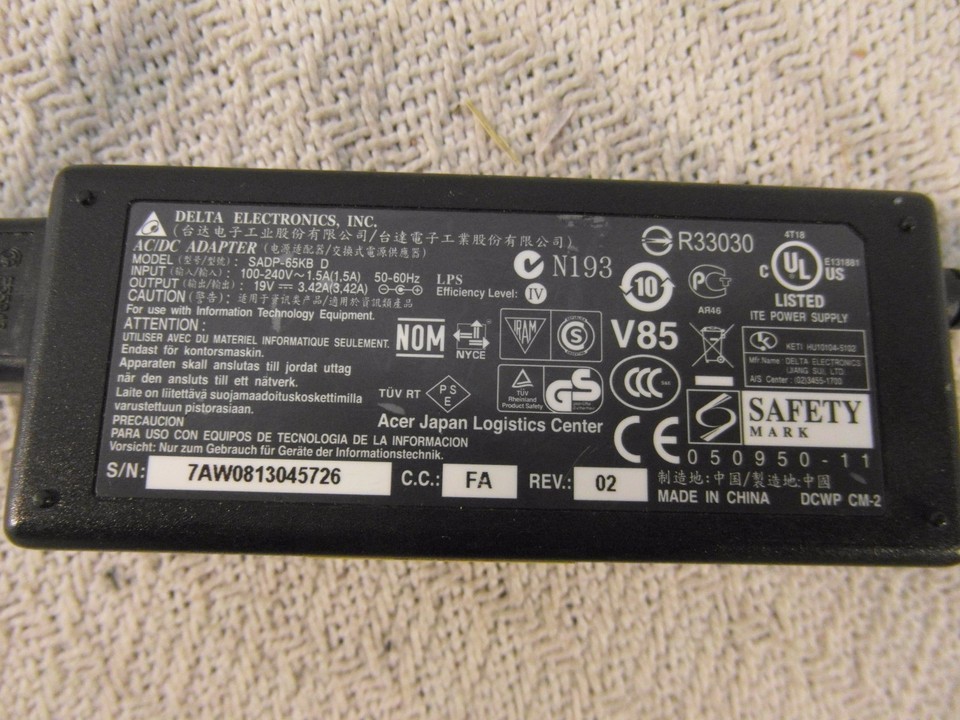 - Delta Electronics Brand Model SADP-65KB AC/DC Computer Charger 33931