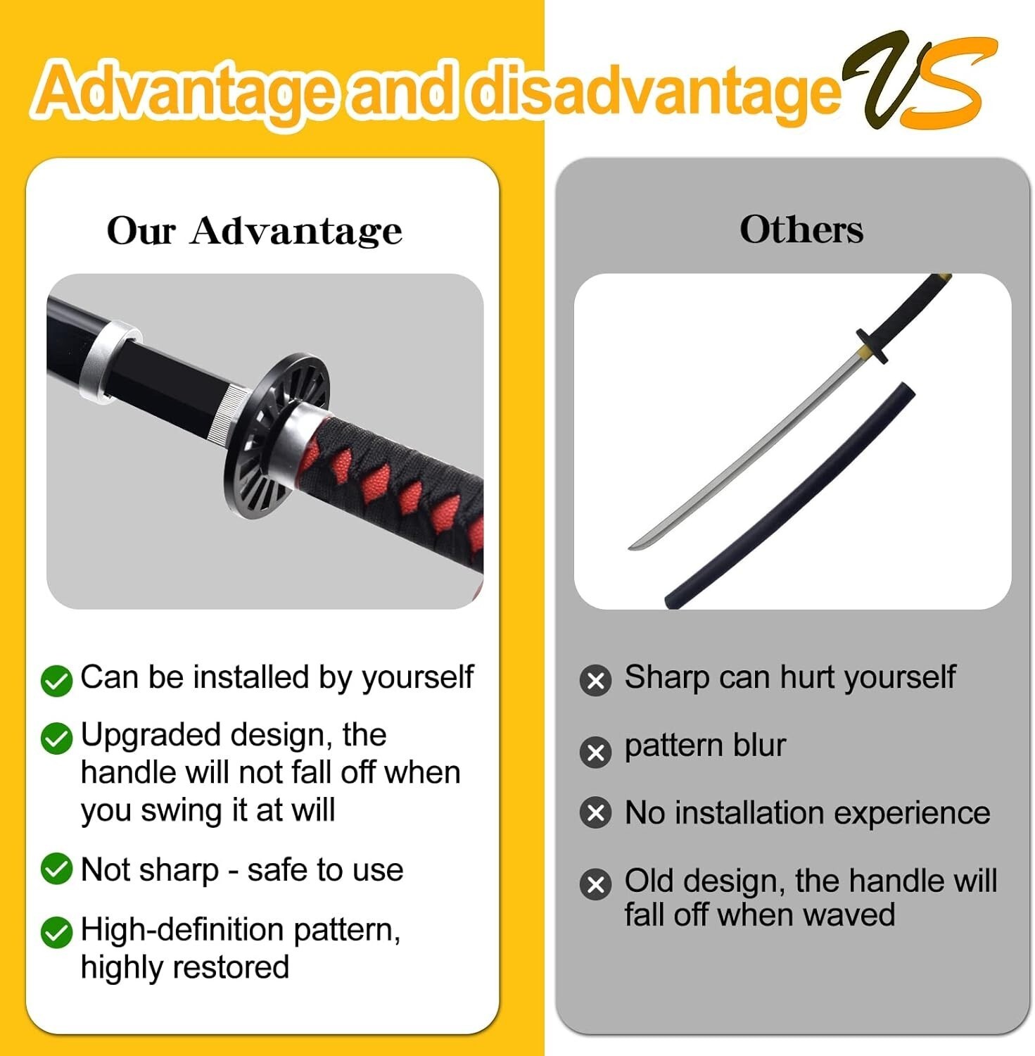 Experience the authentic look and feel of Tanjiro's sword from Japanese anime Demon Slayer with this high-quality replica. Crafted with meticulous attention to detail, the blade, handle, and sheath are made from durable, lightweight polyethylene, ensuring safety and comfort for cosplay. The hand-tied wax rope handle and realistic design make it a perfect choice for fans and cosplayers alike. Weighing 1.1 pounds and measuring 41 inches in length, this sword combines realism with safety. Your purchase includes the sword, a sturdy stand, and a white sword belt. Plus, our friendly 24-hour customer service ensures a worry-free experience.