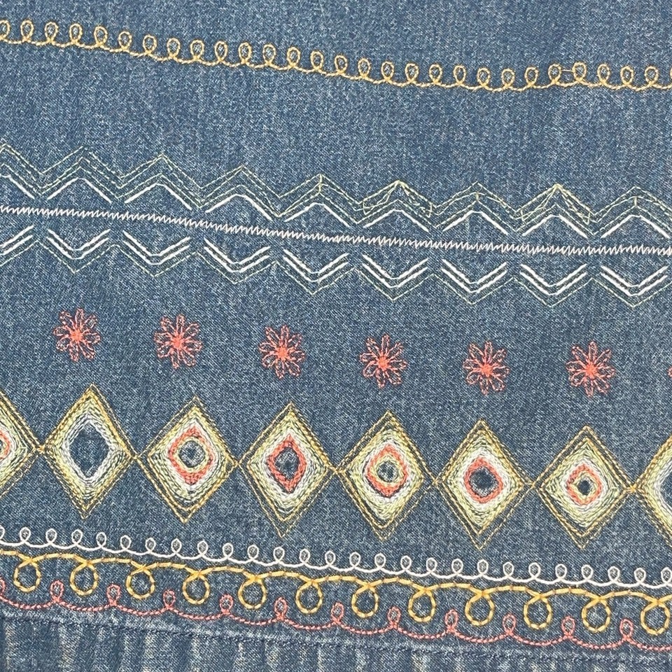 Excellent condition. Embroidered western aztec looking print, goes all the way around on skirt and jacket. Size tag 1X. Jacket measurements: (laying flat) 25.5 inches across the chest and 25 inches overall length. Modest maxi skirt: (laying flat) waist unstretched 16.5 inches, stretched 24 inches, overall length 37.5 inches. Very nice classy denim set. Please see all gallery photos. We are a smoke free, pet friendly home. Have a great day!