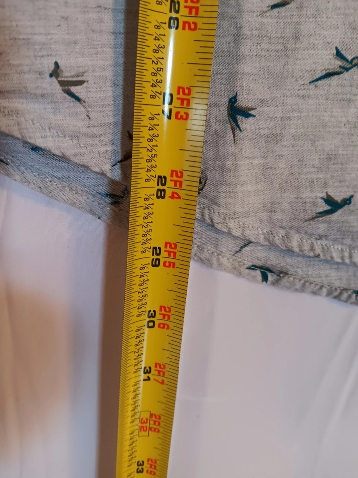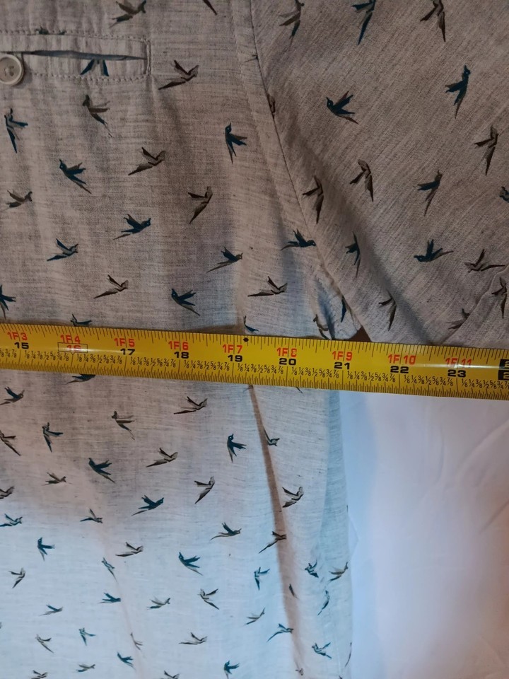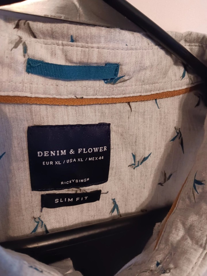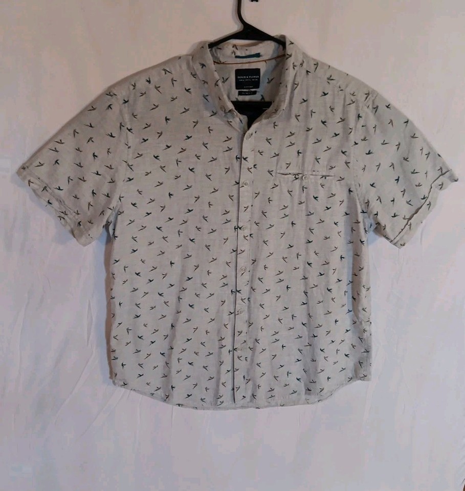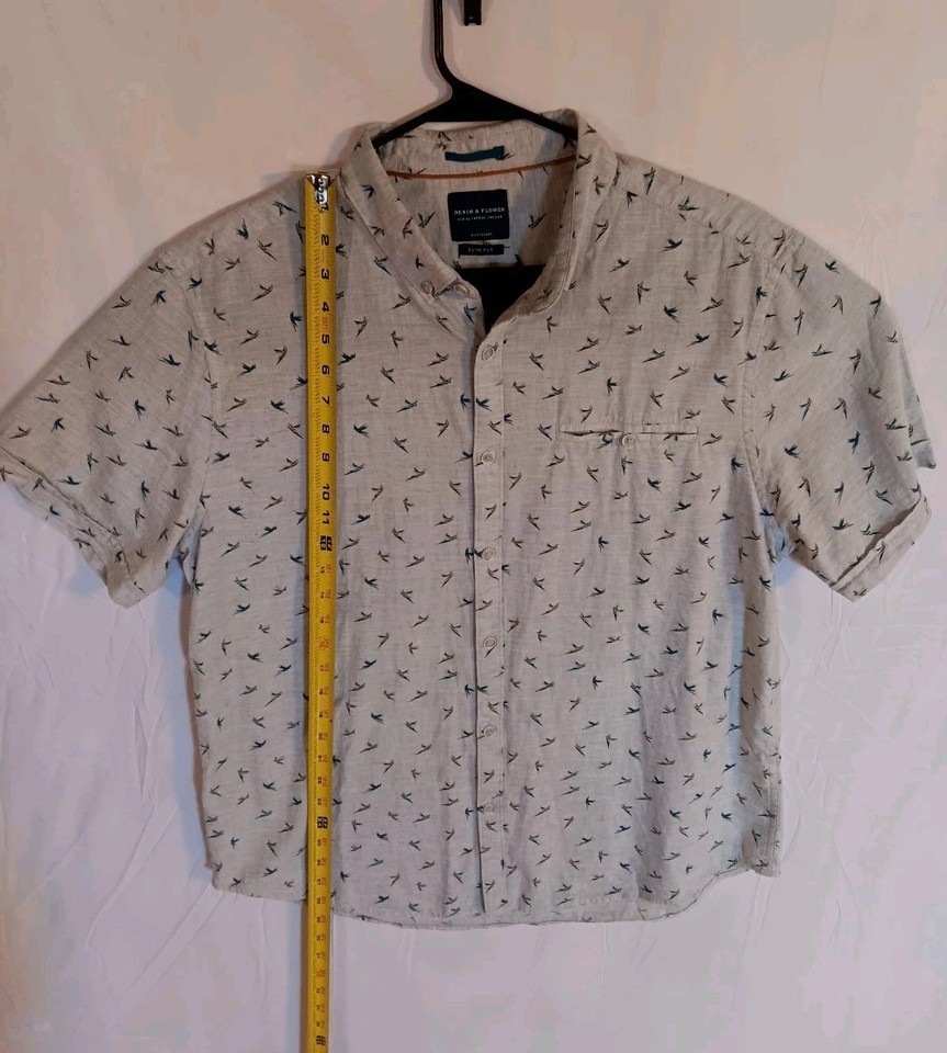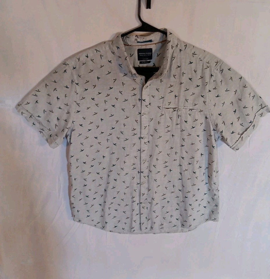 This Denim Flower Ricky Singh men's short sleeve button-up shirt in size XL features a bird pattern in light grayish color, perfect for a casual occasion. Made from cotton fabric, the slim fit shirt with a collared neckline and button closure adds a stylish touch to your summer or spring wardrobe. The graphic print and bird theme make it a unique choice for a fashionable and trendy look. Light wear.
