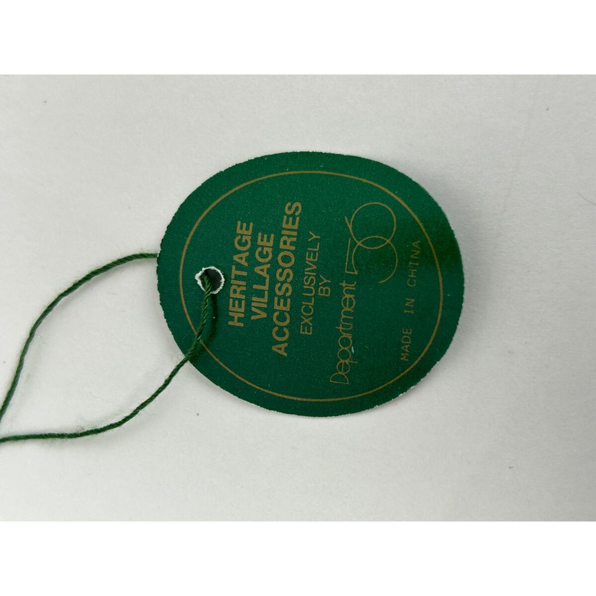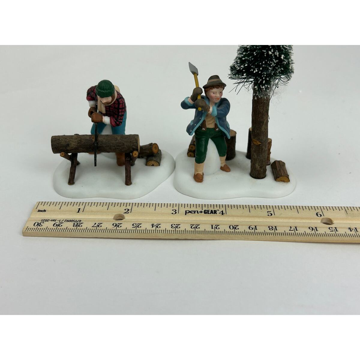 Original Department 56 ? Heritage Village Collection accessory set Lumberjacks (#56590). Two hand-painted figures: one sawing a log on trestles, one chopping beside a snow-tipped tree and stacked wood. Includes original box, foam, and green hang tag as shown.