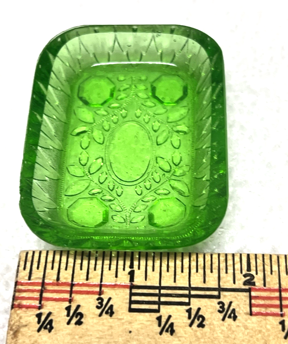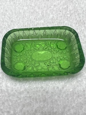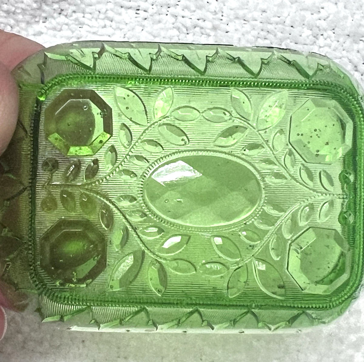Depression Green Glass Open Salt Dip Leaves and Deco Design 3.5 x 1 3/4 x 1/2 In Great shape tiny tiny flea bites on the rim they could be polished out