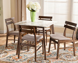 Anchor your dining space with the mid-century modern style of the Derya dining set. Made in Malaysia, the Derya is constructed from durable wood and includes one dining table and four dining chairs. Each chair is foam padded and upholstered in a graceful light-tone fabric that complements the walnut brown finish on the wood. Slatted wood backrests provide excellent back support while allowing light to flow more freely throughout the room. Requiring assembly, the faux marble tabletop gives a luxurious feel, while splayed legs provide ample leg room for each member of the table. With its compact size, the Derya dining set is well suited for dining rooms and nooks with limited space.
