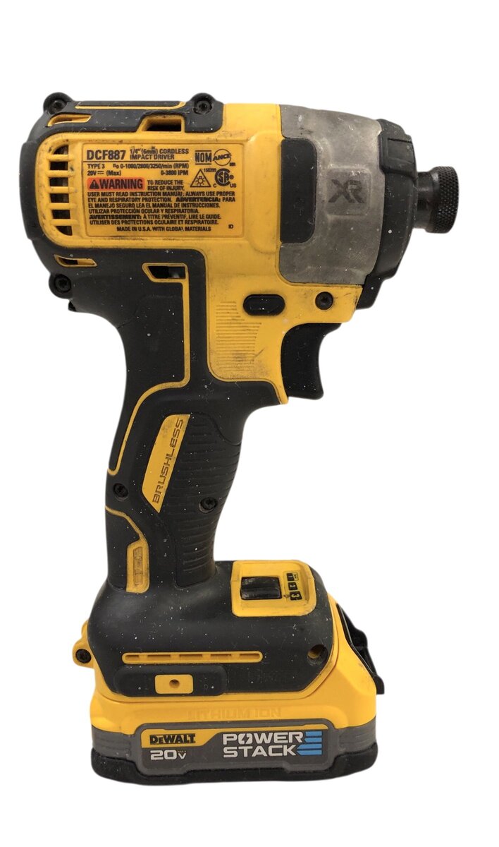 Category: Cordless hand toolsType: Impact DriverBrand: DewaltModel number: DCF887Size: 1/4"Color: YellowPower source: BatteryBattery Included: yesCase included: noCharger Included: yesVoltage: 20VCondition:UsedNotes:Tool, battery, charger.