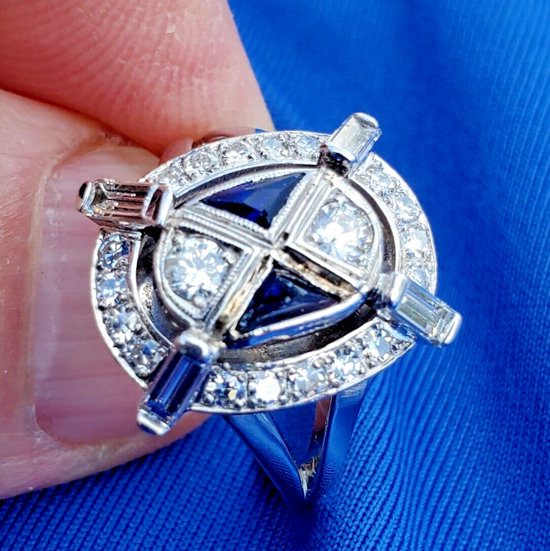 Diamond Sapphire Deco Gatsby style Engagement Ring Vintage Statement 18k Gold