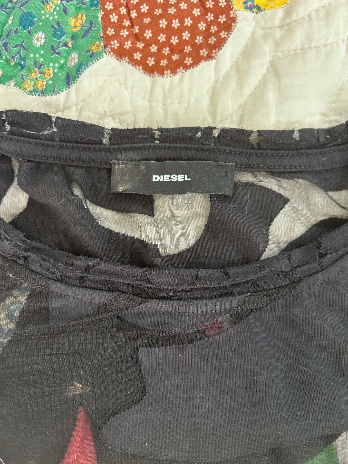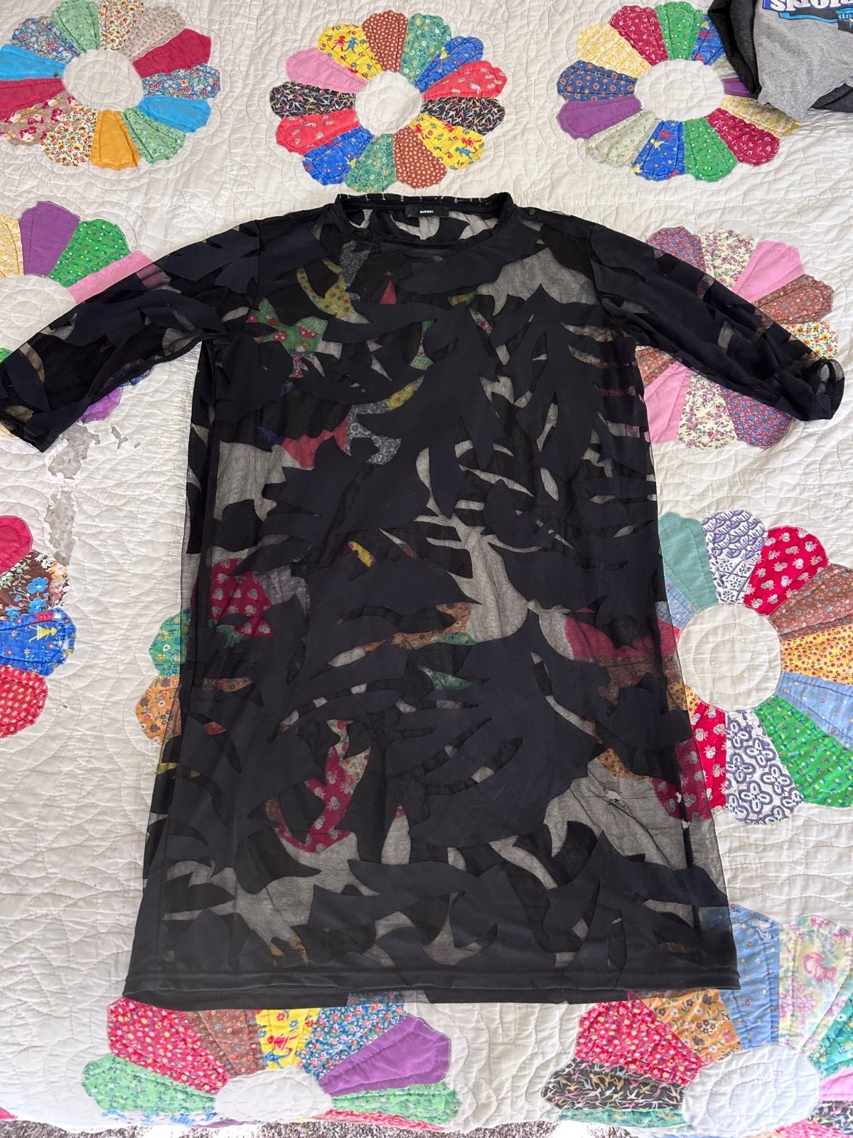 Diesel Dress Black Sheer midi sheath 3/4 sleeve women's M L swim cover designer. Button at neck closure. Size tag is missing so please check measurements to ensure a proper fit.