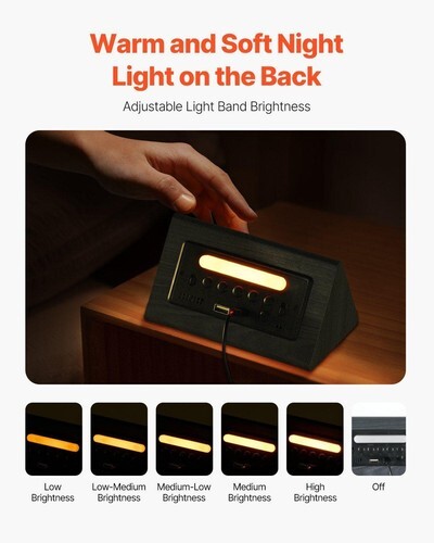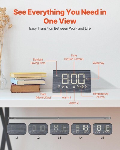 Clear Multi-Function Display: This alarm clock shows everything you need at a glance-time (12/24-hour), date, day of the week, indoor temperature (F/C), and daylight saving time settings. The screen has 5 brightness levels, so you get a clear, easy-to-read display, whether it's day or night.