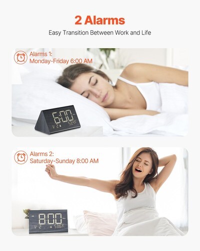 Dual Alarm Adjustable Volume: You can set two alarms independently for different days or events, making sure you're always on time. With three volume levels, you can find the ideal sound to wake you up-loud enough to get you going, but not too harsh. Plus, the 9-minute snooze button gives you a little extra time to ease into your day.