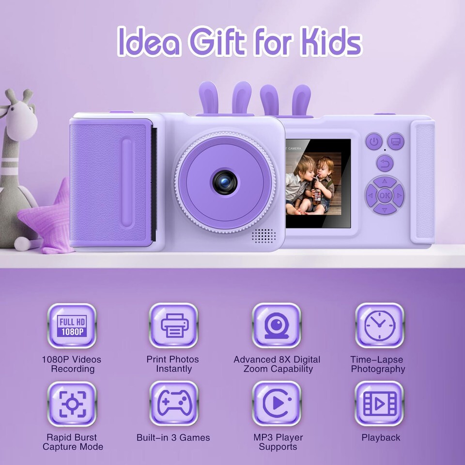 Camara instantanea versatil y divertida para niños: la camara instantanea multifuncion SSA Creative ofrece mas que solo disparar e imprimir. Incluye características atractivas como tres juegos de rompecabezas populares. Equipado con una pantalla IPS HD de 2.4 pulgadas, la camara admite captura de fotos de 8MP, grabacion de video 1080P, fotografía de lapso de tiempo y grabacion cíclica. Ademas, permite transferencias de MP3 y fotos a traves de una conexion USB a una computadora. Ideal para capturar y preservar recuerdos de la infancia, esta camara esta diseñada para deleitar a los niños con sus diversas funciones y elementos interactivos.