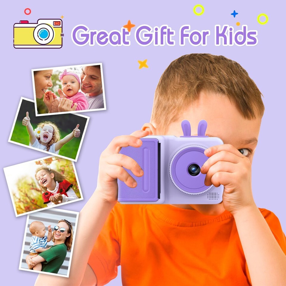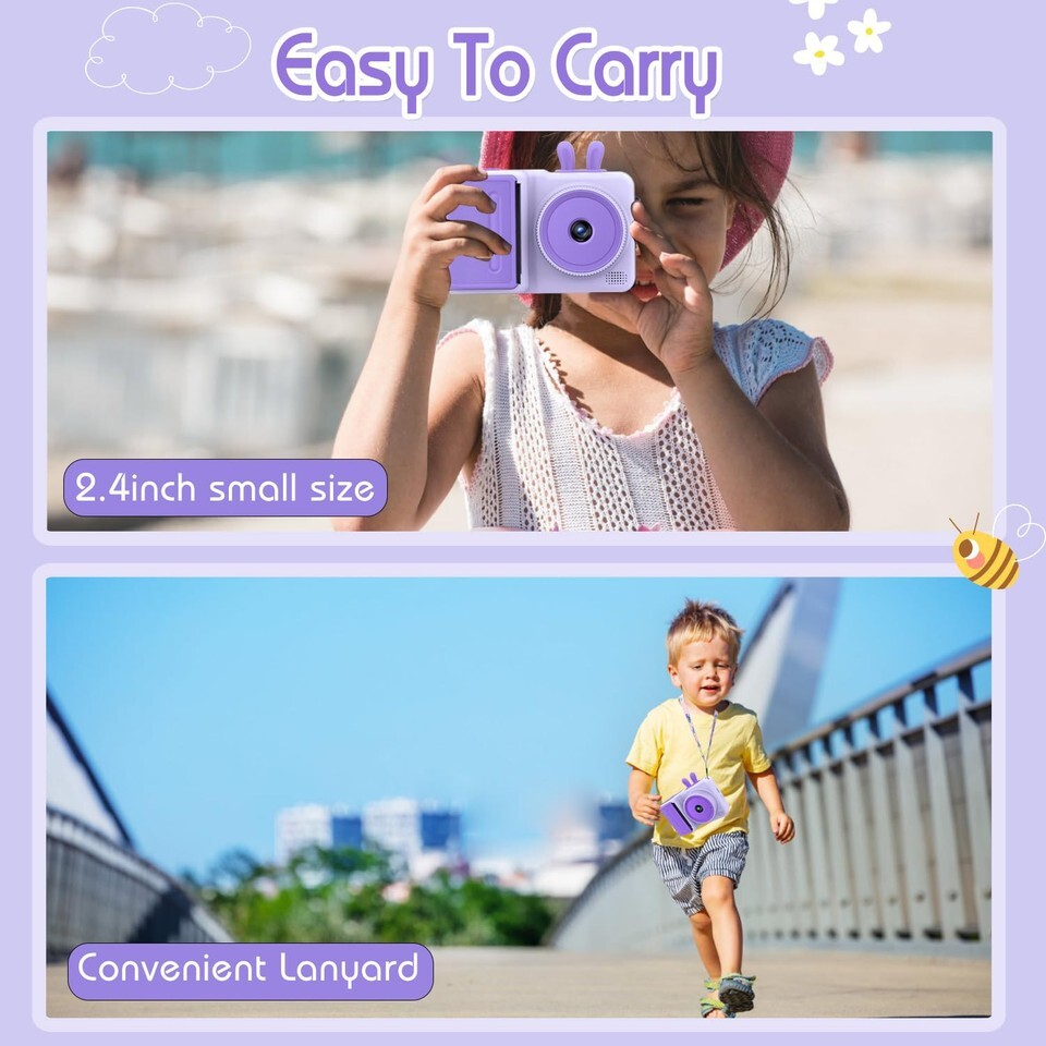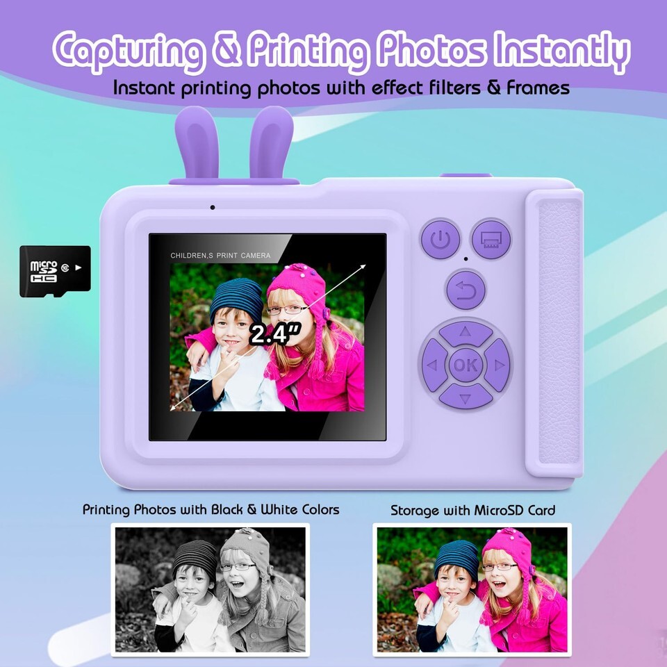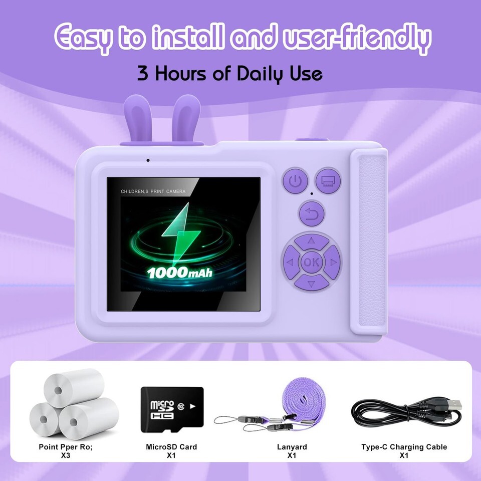 ?Encantador juguete de camara para niños?La camara de fotografía de papel SSA cuenta con un adorable diseño de conejo y un cuerpo ligero con un practico cordon, por lo que es facil para los niños llevar e imprimir fotos sobre la marcha. Incluye una batería de 1000 mAh, que proporciona hasta 3 horas de uso, perfecta para viajes o viajes por carretera. La tarjeta MicroSD incluida permite a los niños almacenar sus preciosos momentos y transferirlos a una computadora portatil para compartirlos con la familia. Esta camara es un regalo ideal para capturar y disfrutar de recuerdos.