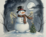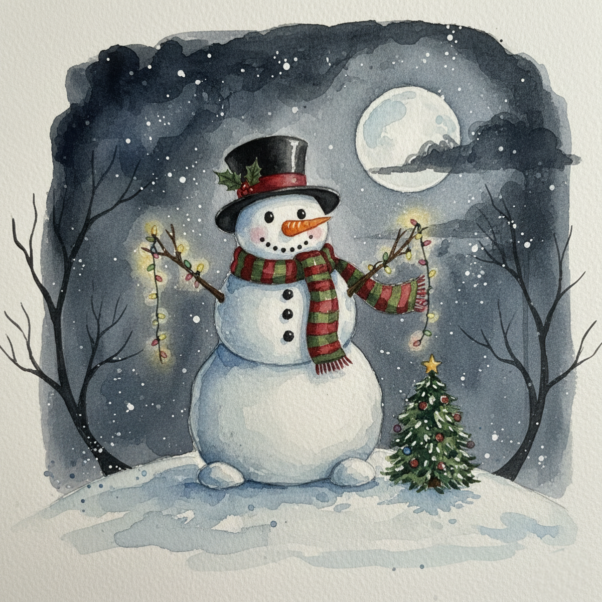 A classic, friendly snowman bundled in a festive red and green striped scarf and a top hat adorned with holly. He stands in a snowy, moonlit landscape, holding strings of twinkling Christmas lights, with a small decorated pine tree beside him.