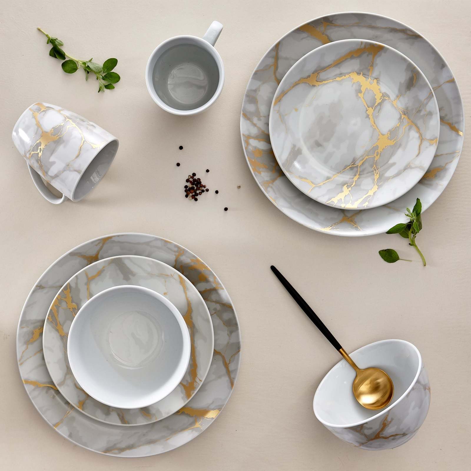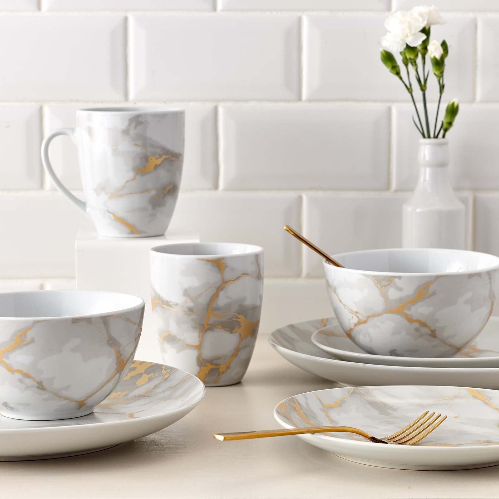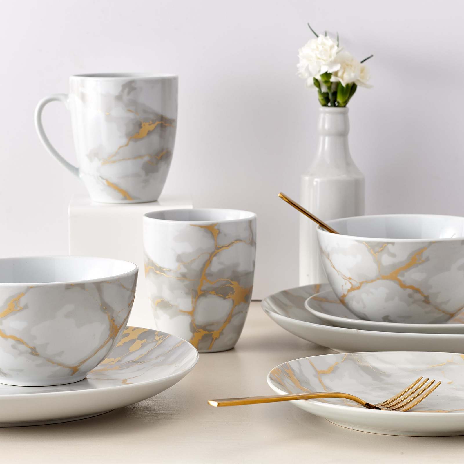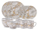 - Dinnerware Set 16 Piece Coupe Porcelain Gold Marble Look Service for 4