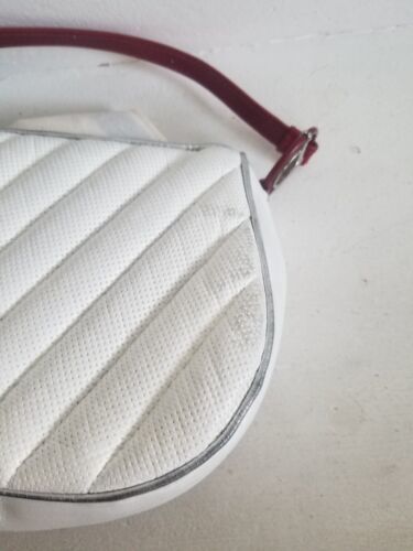 This Dior handbag is a medium-sized, vintage piece from the 2001 John Galliano Trailer collection. The bright red leather bag features accents like a licence plate and steering wheel, with a perforated finish. The design is inspired by Cadillacs and hotrods, with a shoulder strap handle in red patent leather. The interior is lined in red polyester and includes inner pockets. This limited edition piece exudes a rock and punk theme with a retro flair.