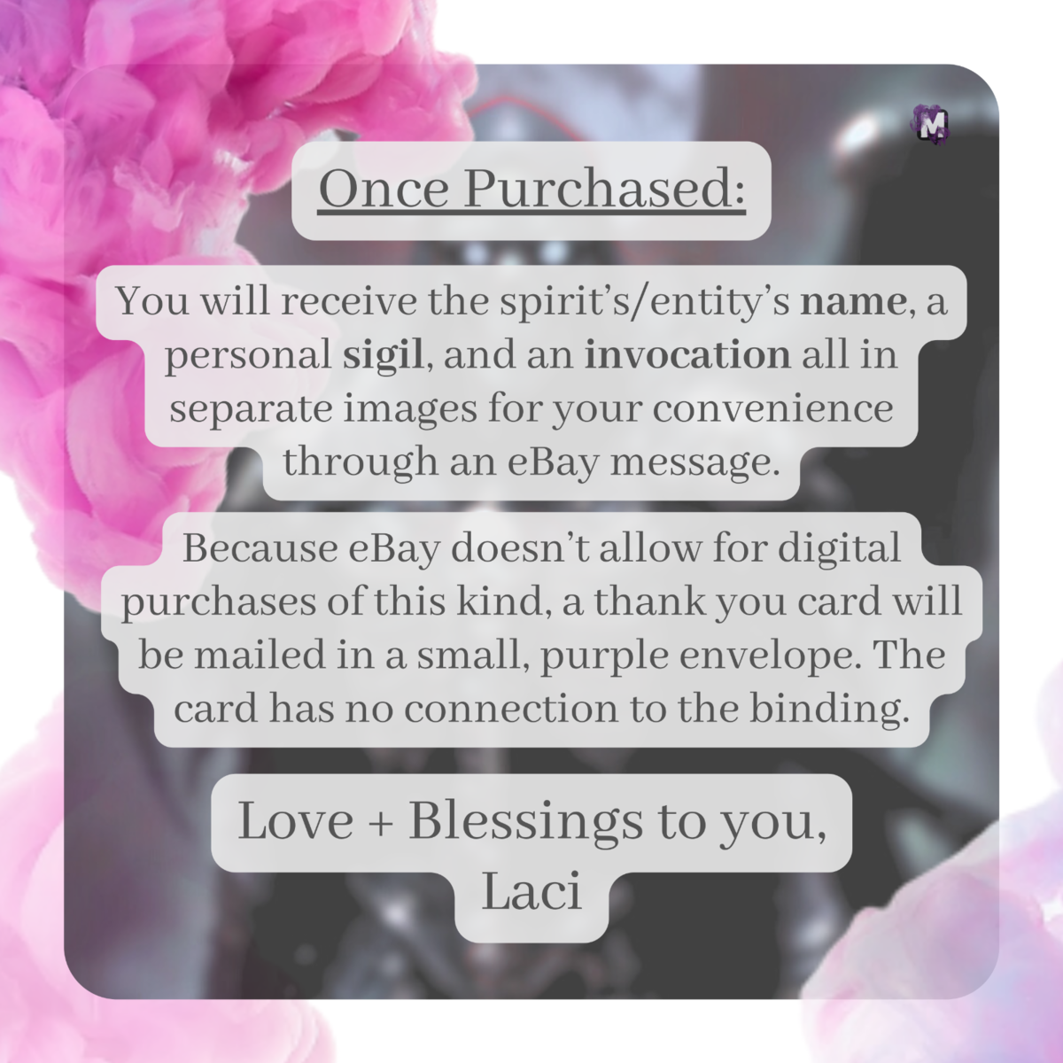 Once purchased, You will receive the spirit?s/entity?s name, a personal sigil, and an invocation all in separate images for your convenience through an message. Please give me some time in case I am asleep or otherwise occupied. I will send everything along as soon as I can.