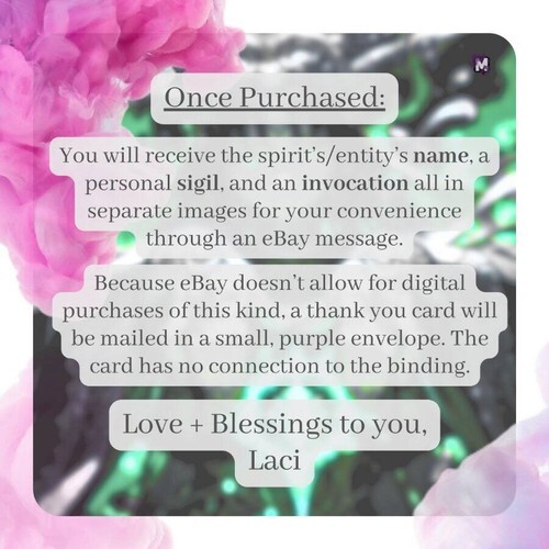 Once purchased, You will receive the spirit?s/entity?s name, a personal sigil, and an invocation all in separate images for your convenience through an message. Please give me some time in case I am asleep or otherwise occupied. I will send everything along as soon as I can.