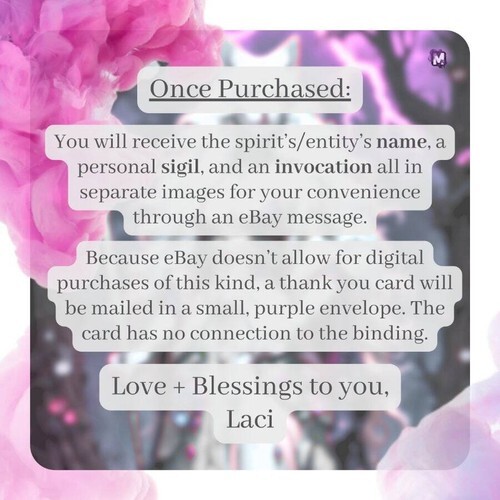 Once purchased, You will receive the spirit?s/entity?s name, a personal sigil, and an invocation all in separate images for your convenience through an message. Please give me some time in case I am asleep or otherwise occupied. I will send everything along as soon as I can.