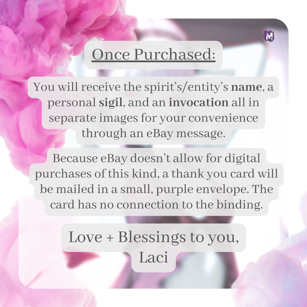 Once purchased, You will receive the spirit?s/entity?s name, a personal sigil, and an invocation all in separate images for your convenience through an message. Please give me some time in case I am asleep or otherwise occupied. I will send everything along as soon as I can.
