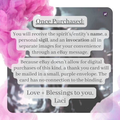 Once purchased, You will receive the spirit?s/entity?s name, a personal sigil, and an invocation all in separate images for your convenience through an message. Please give me some time in case I am asleep or otherwise occupied. I will send everything along as soon as I can.