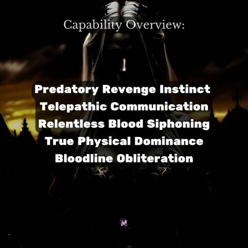 Relentless Blood Siphoning: She knows no rest until her hunger is sated, drawing life force with every encounter. Her Blood Siphoning sustains her in her quest and fortifies her connection to the darkness she commands, ensuring she remains an unstoppable force. No matter how fierce the opposition, she will siphon strength from each victory, only growing more potent.