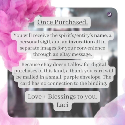 Once purchased, You will receive the spirit?s/entity?s name, a personal sigil, and an invocation all in separate images for your convenience through an message. Please give me some time in case I am asleep or otherwise occupied. I will send everything along as soon as I can.