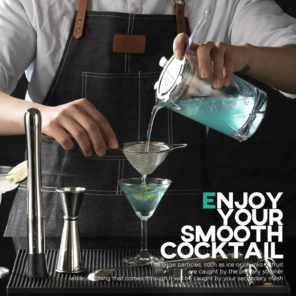 Pour the drink through the main and fine strainer for perfectly smooth cocktails.