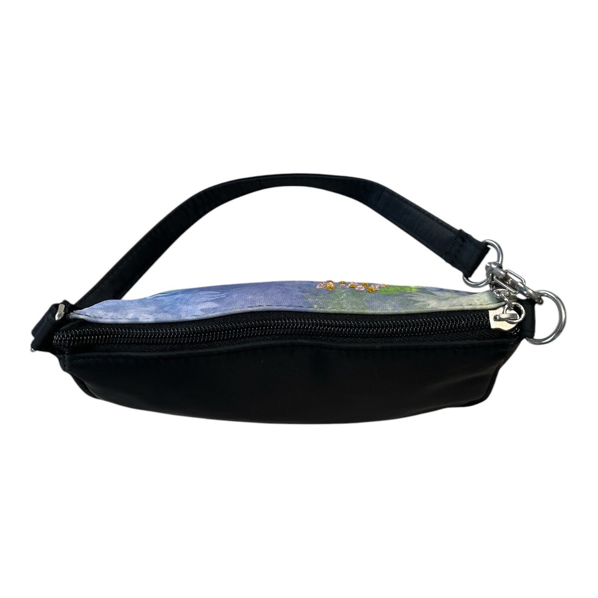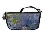 Cute early-2000s Disney Eeyore mini shoulder bag featuring a watercolor-style blue/purple background and sparkly rhinestone flower accents. Includes detachable short strap and top zipper closure. A fun collectible piece for Winnie the Pooh and Eeyore fans.
