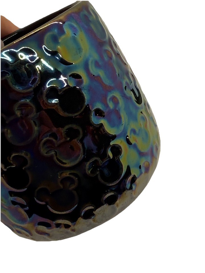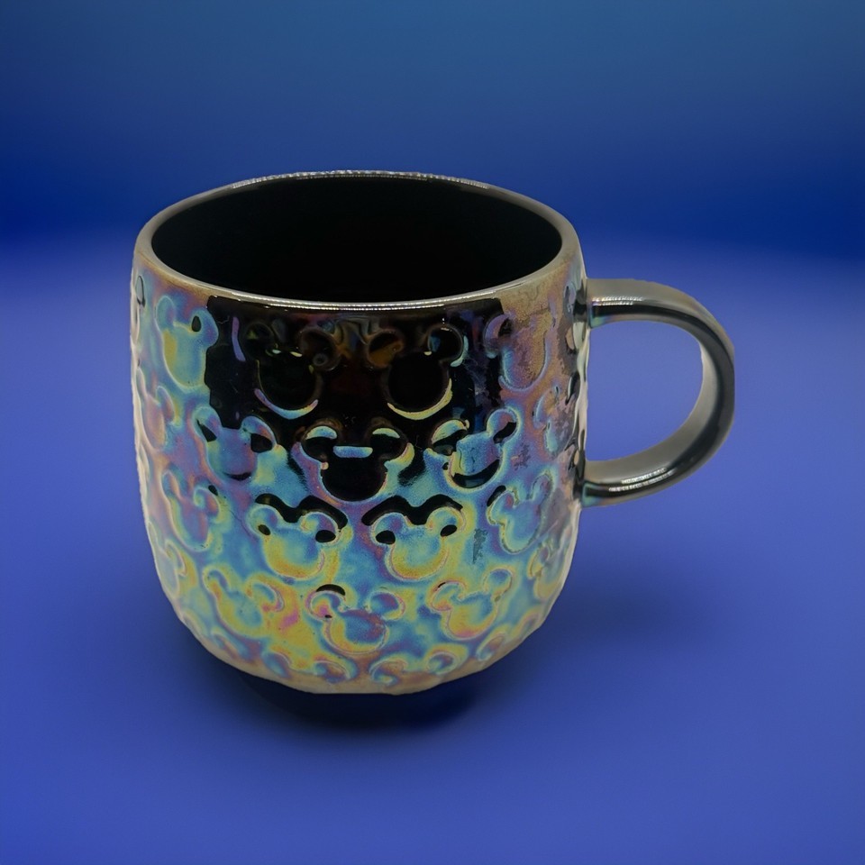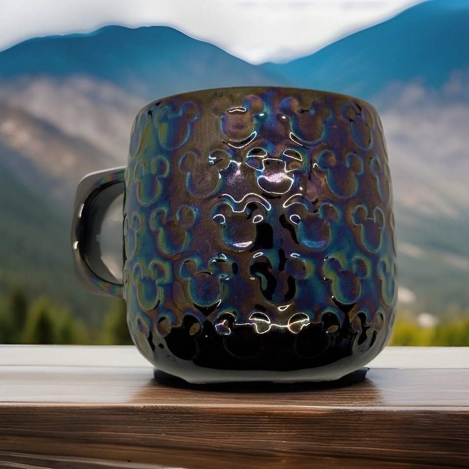 This Disney Mickey Mouse Icon Mug is a 16 oz coffee or tea mug featuring the iconic character Mickey Mouse from the beloved Disney franchise. With raised icons and a unique colorful iridescent multi finish, this contemporary mug is a must-have collectible for Disney fans. It's hard to capture in pictures but the mug shimmers and reflects many different colors! The design, which includes the year 2025, showcases the timeless charm of Mickey Mouse in a sleek and modern style, making it a perfect addition to any Disney collectibles display.
