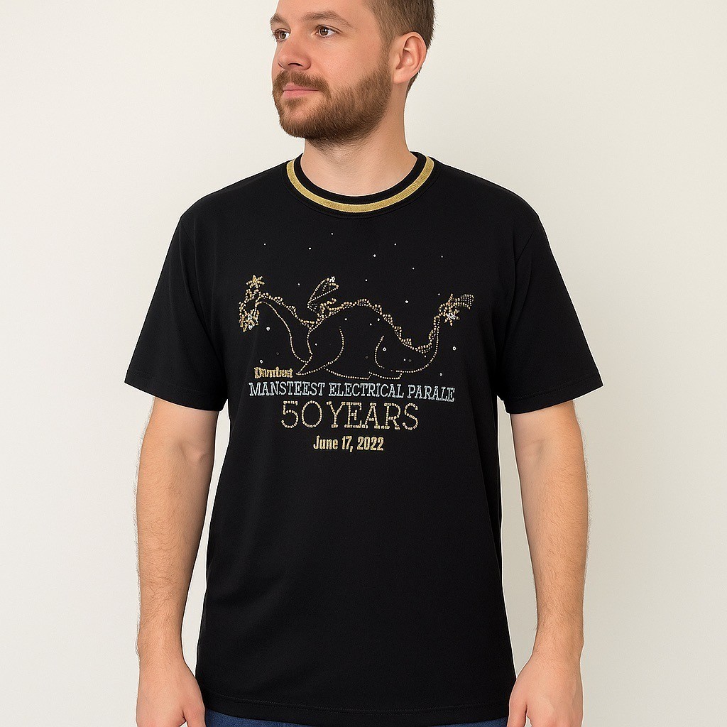Celebrate a beloved Disney tradition with this limited-edition Disneyland Main Street Electrical Parade 50th Anniversary T-shirt. This black unisex tee features a dazzling design of Elliott the dragon outlined in gold and white dots with sparkling star accents and commemorative text reading *?50 Years ? June 17, 2022.?* The gold-trimmed neckline adds a festive touch, making it perfect for collectors or park fans.
