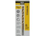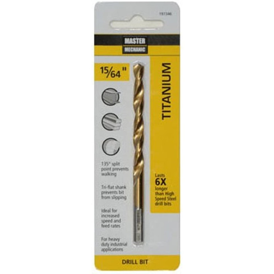 Master Mechanic, 15/64" x 3-7/8", high speed steel, titanium coated drill bit, 135 split point, jobber length, straight shank, 135 split point design with 4 cutting edges eliminates walking permits quick accurate starting, added lubricity of titanium-nitride surface finish enhances chip flow, drilling efficiency increases drill life, recommended for heavy duty drilling in wood, plastic, Wallboard, plywood soft metals for moderate use in heat treated or ferrous metals, Carded.