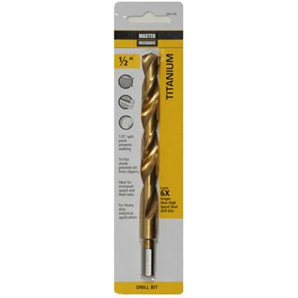 Master Mechanic, 1/2" x 6", high speed steel, titanium coated drill bit, 135 split point, jobber length, 3/8" shank, 135 split point design with 4 cutting edges eliminates walking permits quick accurate starting, added lubricity of titanium-nitride surface finish enhances chip flow, drilling efficiency increases drill life, recommended for heavy duty drilling in wood, plastic, Wallboard, plywood soft metals for moderate use in heat treated or ferrous metals, Carded.