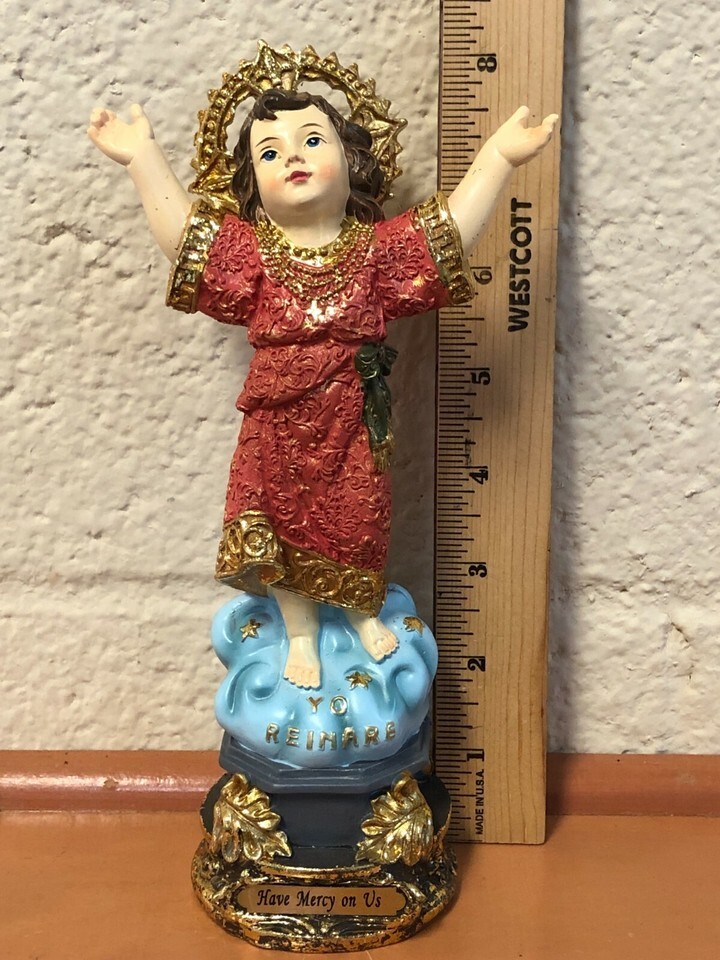 You are purchasing a beautiful colorful 8.5" statue of Divino Nino, also known as Divino Nino of Bogota or Divine Child Jesus. It is hand painted and on standing base is inscribed with "Have Mercy on Us" This devotion and image comes from the devotion to our Child Jesus in Colombia. Where it's known to have miraculous powers of fertility and healing. On bottom the base it reads" Have Mercy of Us". It has a glitter shine gold trim on it.