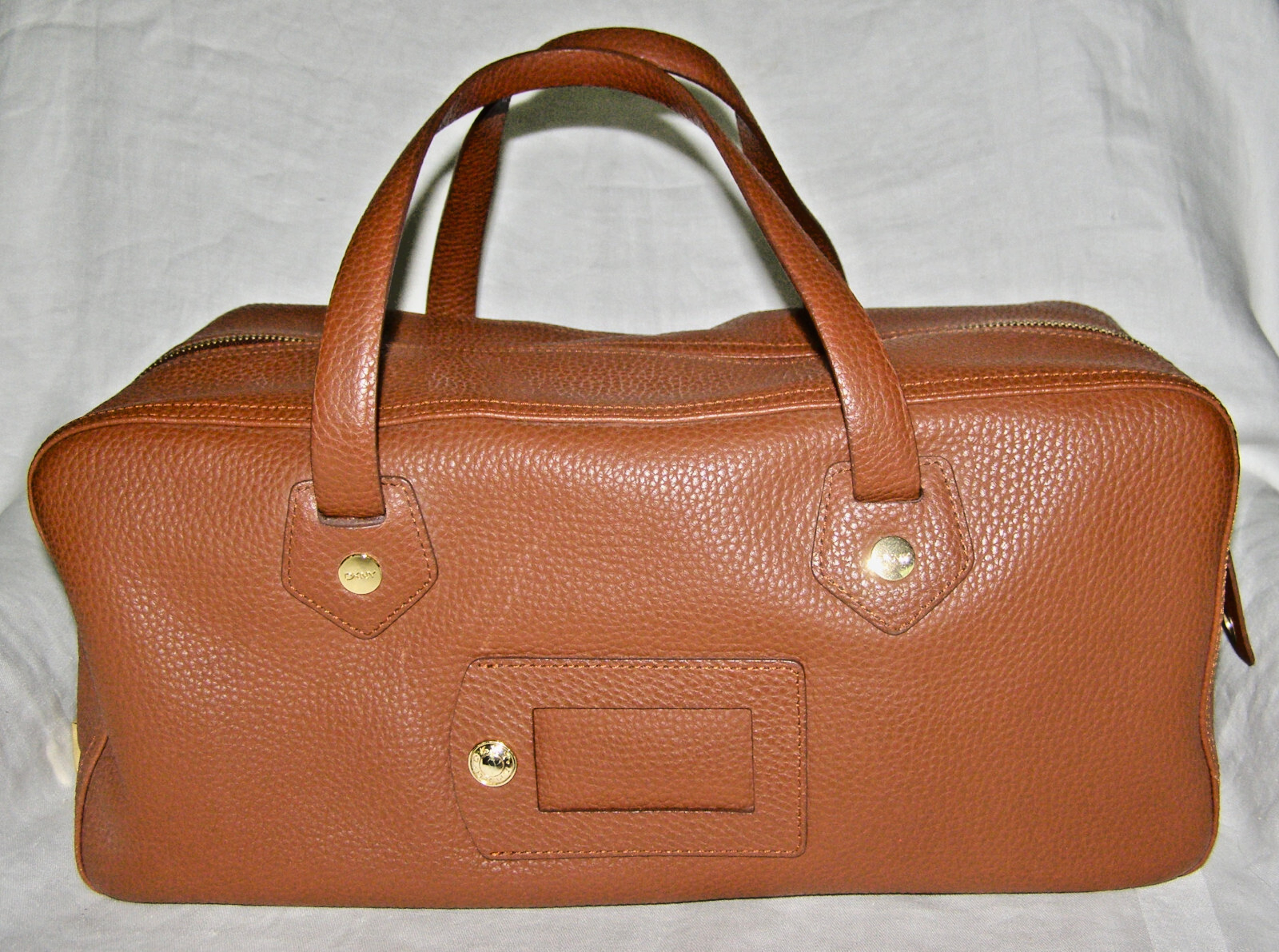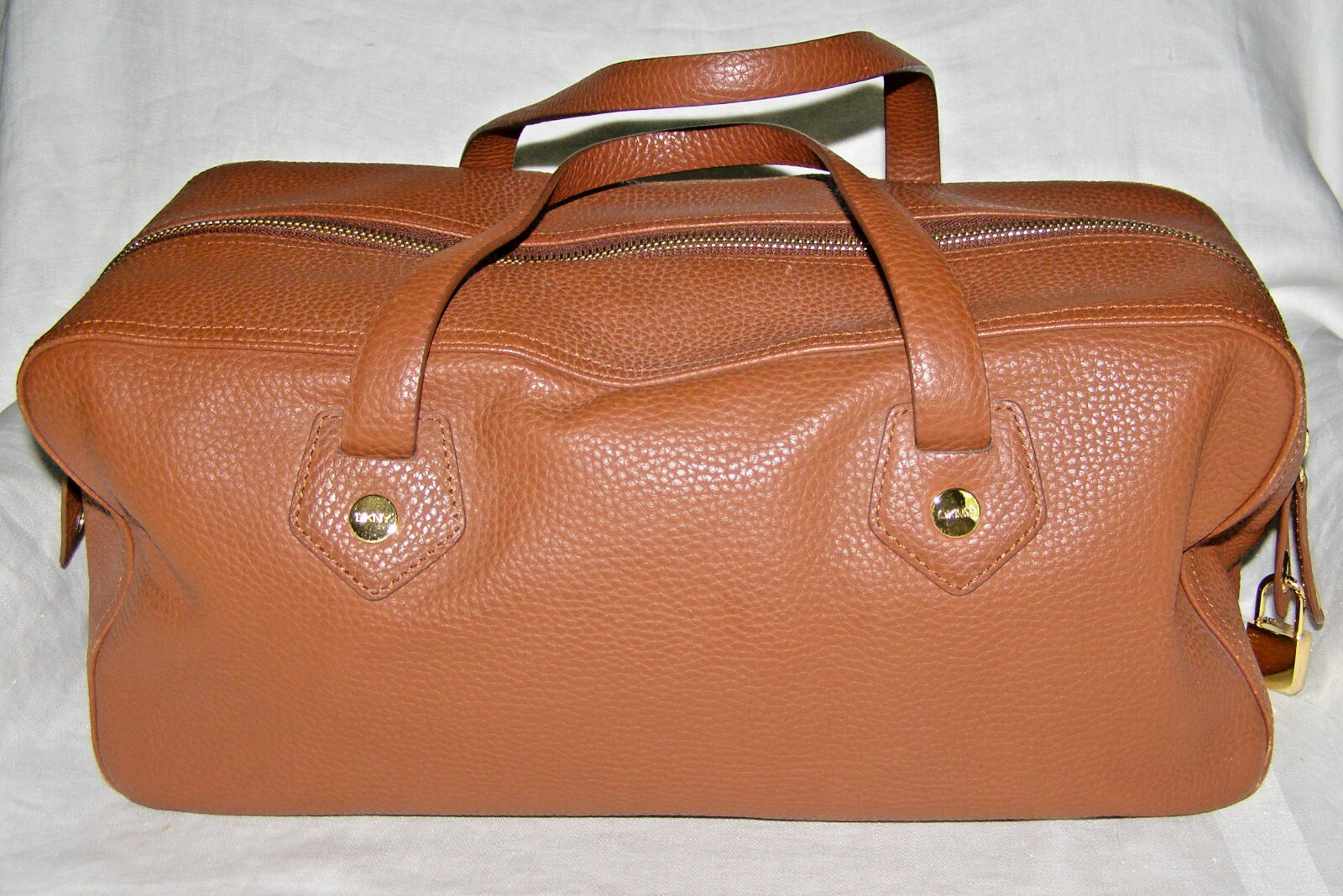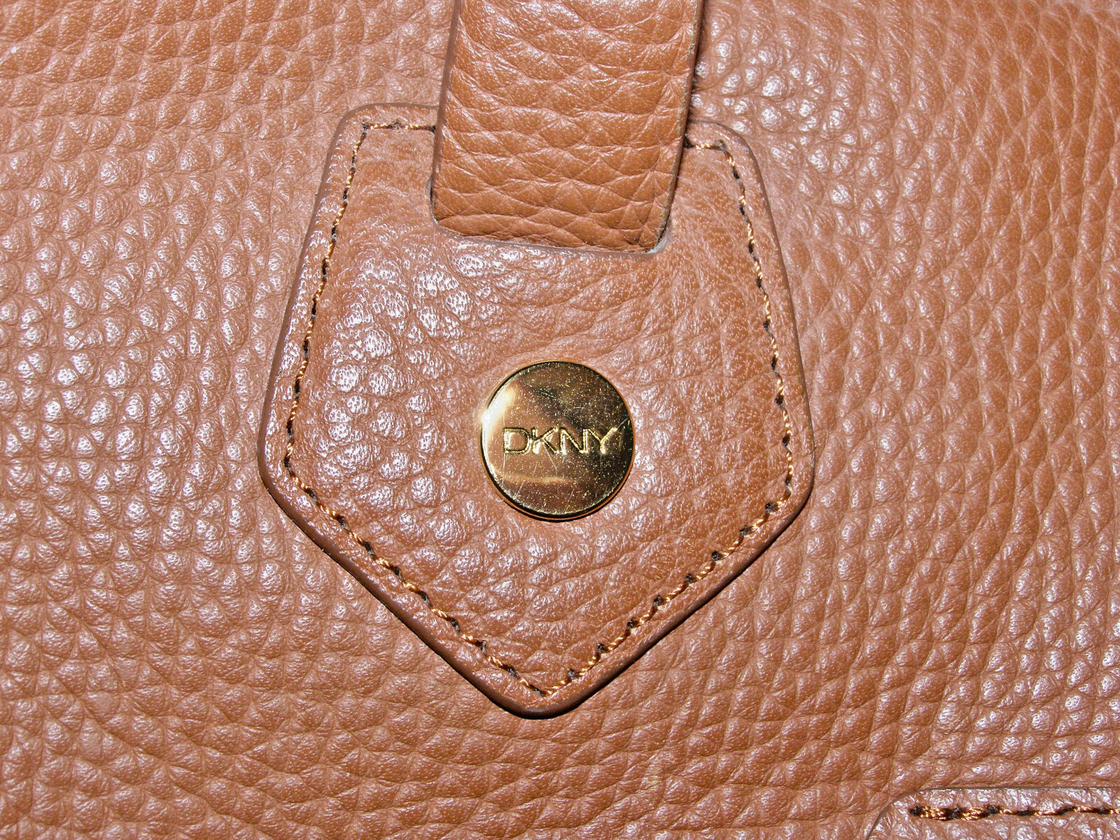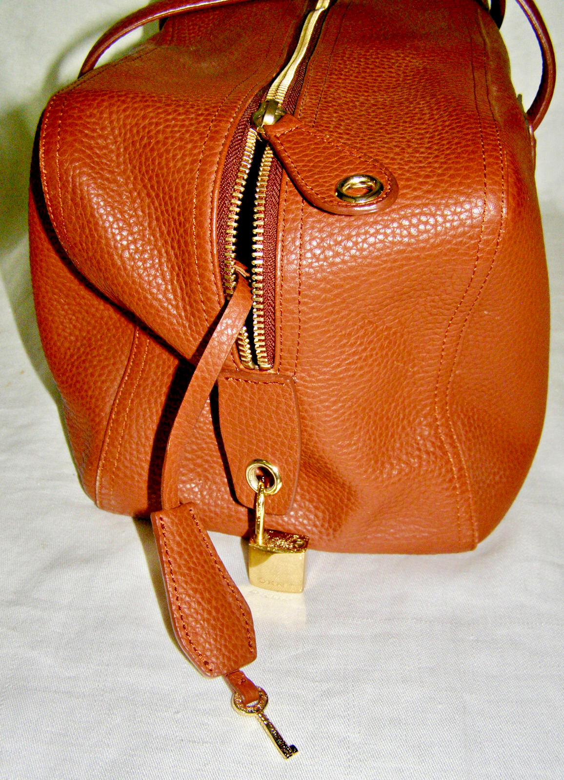 - DKNY BROWN VEGAN LEATHER OVERNIGHT BAG w/ PEBBLE TEXTURE FINISH + LOCK AND KEY
