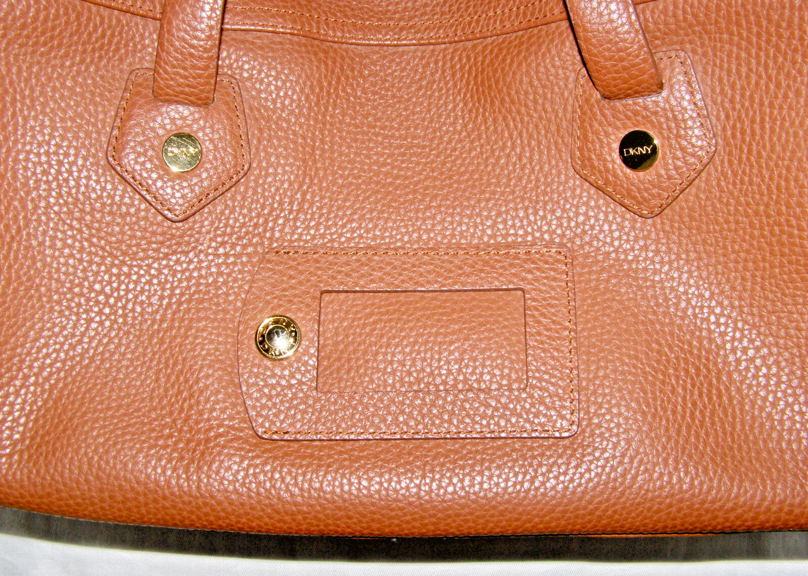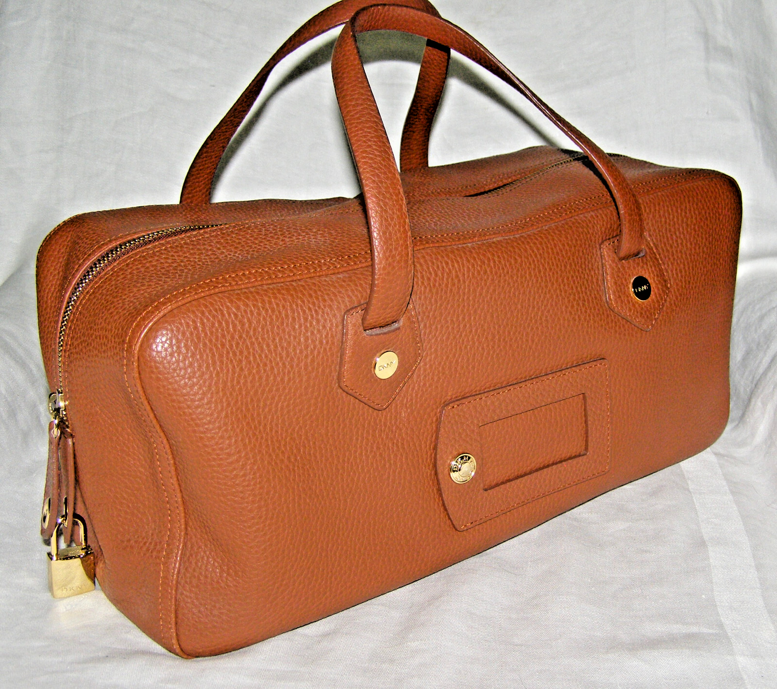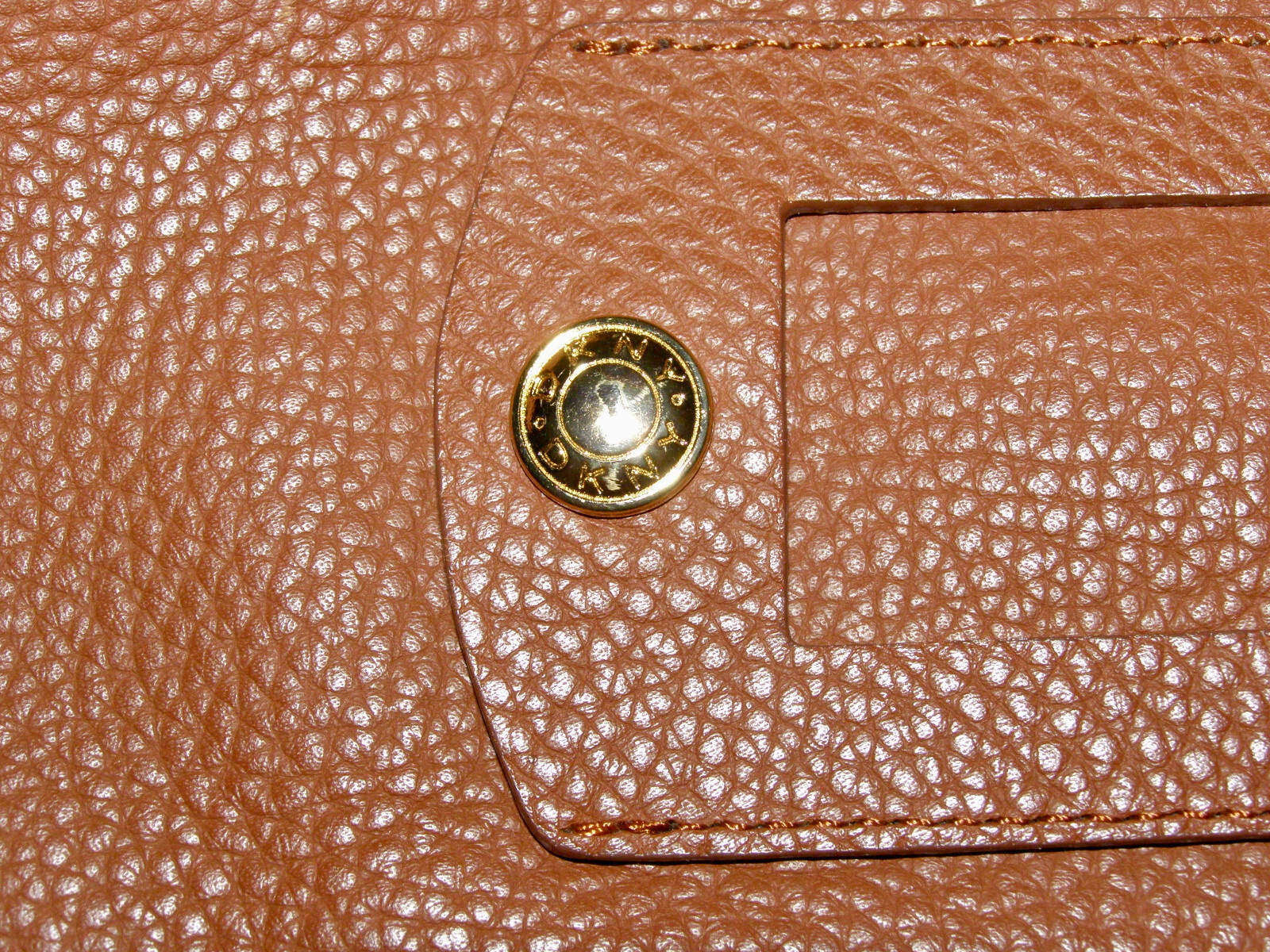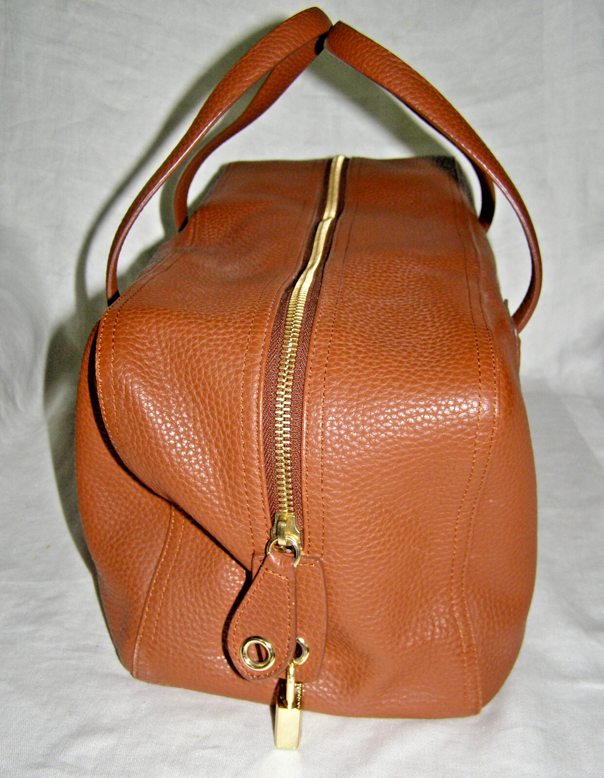 - DKNY BROWN VEGAN LEATHER OVERNIGHT BAG w/ PEBBLE TEXTURE FINISH + LOCK AND KEY