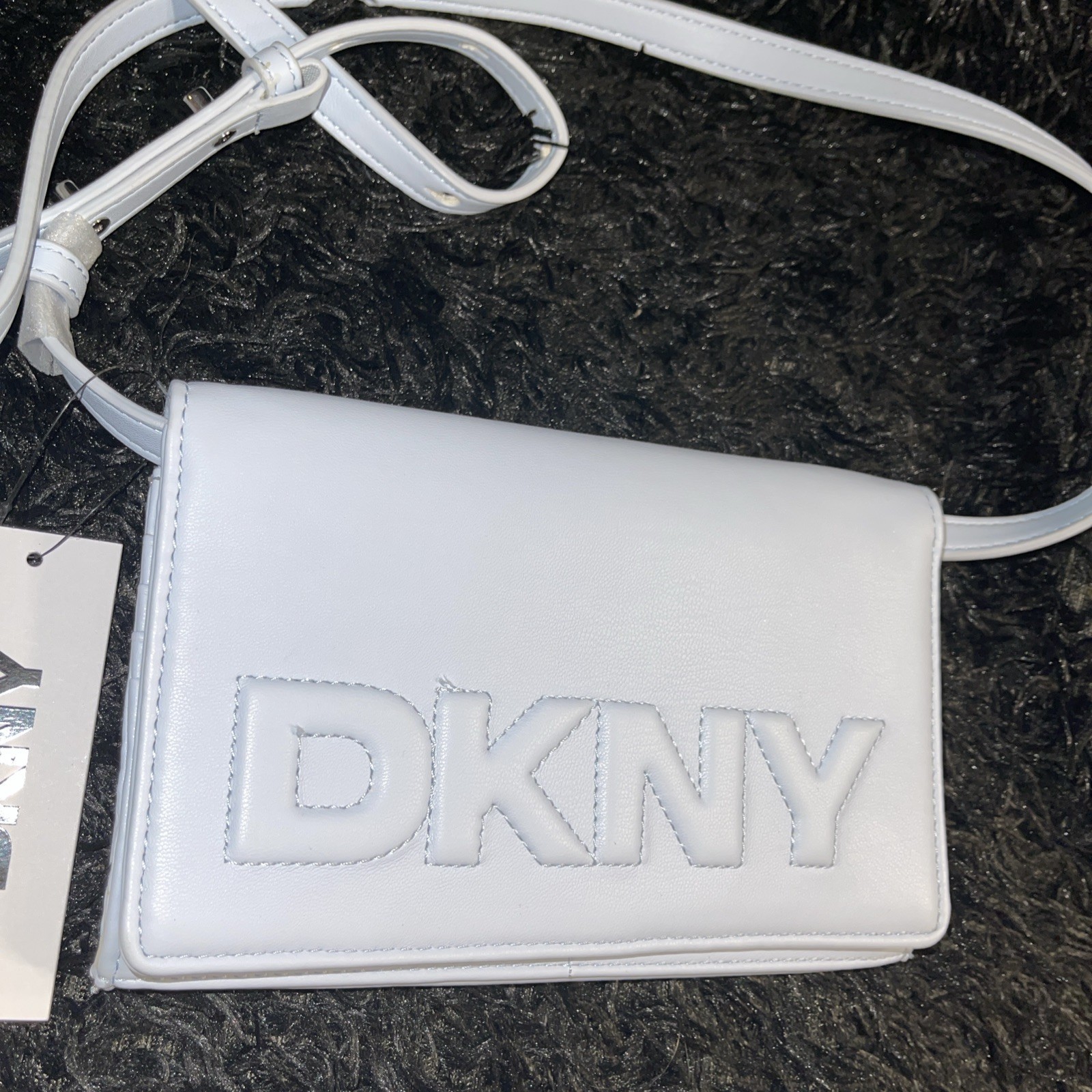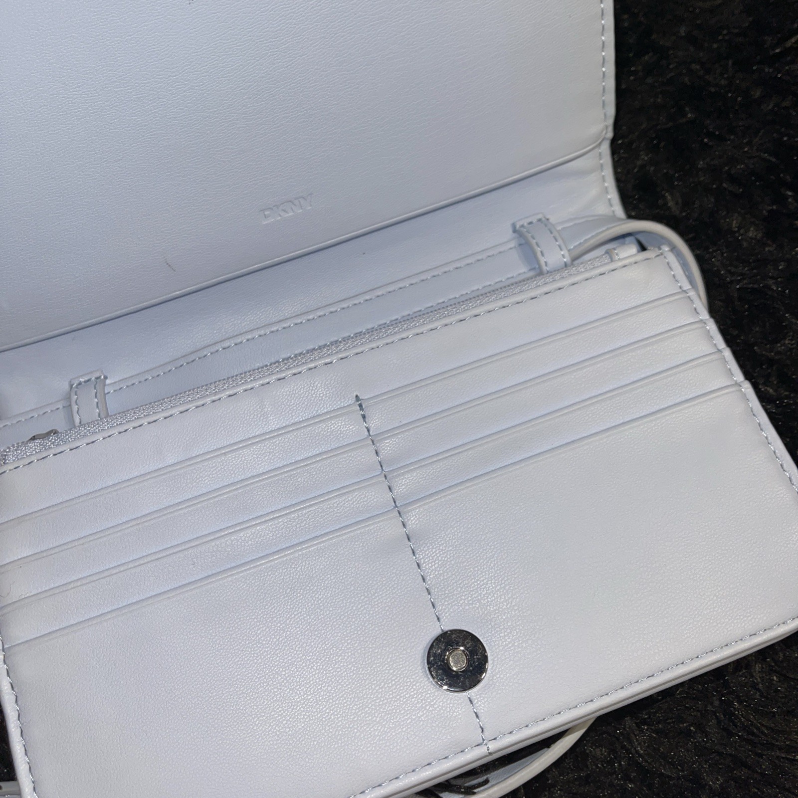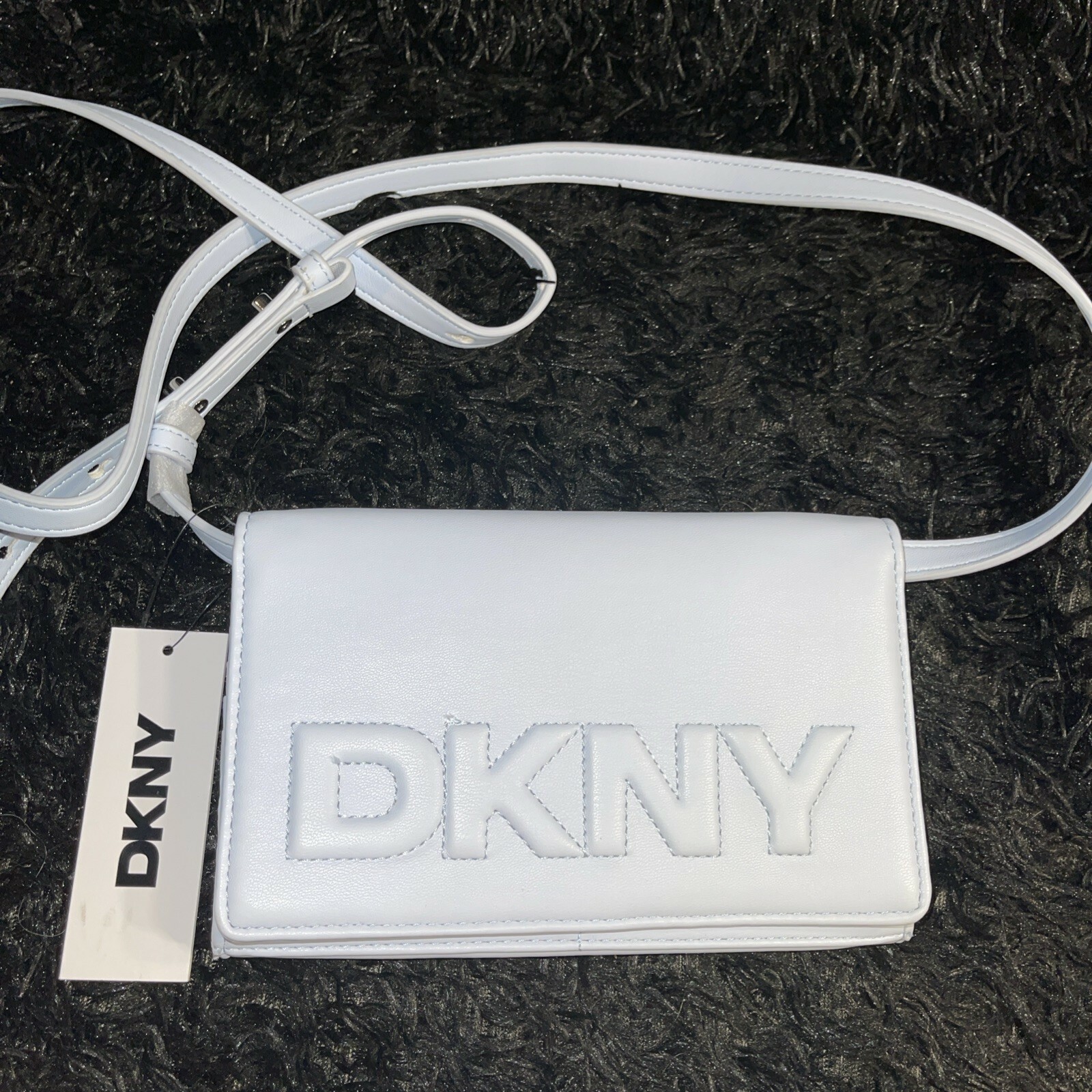 DKNY wallet on a Xbody is the perfect accessory for any fashion-forward woman. The marshmallow color is light and airy, perfect for Spring and Summer. The wallet is stylish and functional, with plenty of room for all of your essentials. It's brand new, so you can be sure you're getting a quality product.