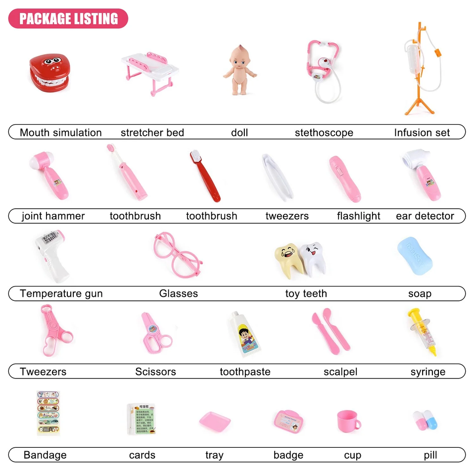 Medical kit includes various medical supplies and common medicines, allowing children to learn more about medical knowledge. This doctor kit is made of high-quality wood, which is very sturdy and durable, and is full of educational and entertainment value. Children can cultivate their imagination and creativity during role-playing, while also learning medical knowledge and skills. This doctor kit is an excellent companion for children's growth and a perfect gift. For imaginative play medical kit includes various medical supplies such as a blood pressure monitor, syringe, surgical scalpel, hand sanitizer, and some common medicines such as pills and tablets. In addition, there is a patellar reflex hammer and a thermometer, allowing children to learn more about medical knowledge.